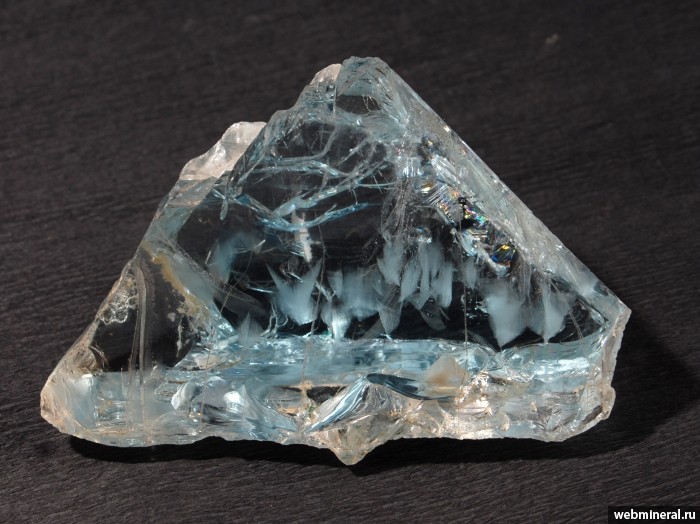 Спайный обломок прозрачного кристалла топаза с очень характерными белыми конусовидными включениями скелетных кристаллов флюорита.