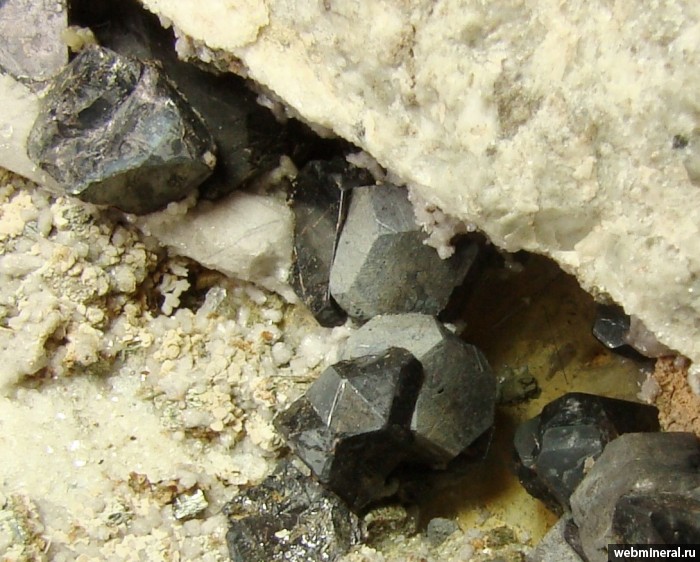 Галенит среди кристаллов темного сфалерита, отличающийся от последнего серым цветом. В полости присутствует также кварц и недотравленный доломит.