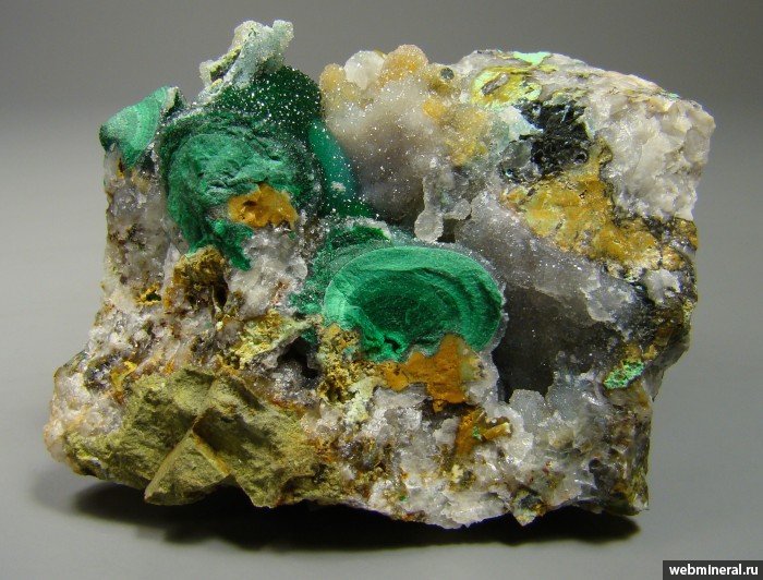 Сферолиты малахита в кварц-халцедоновом прожилке, рассекающем скарновую породу.