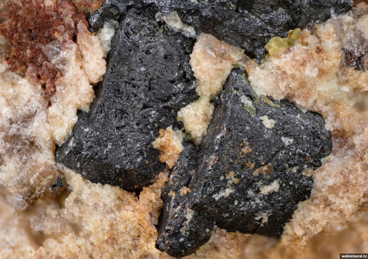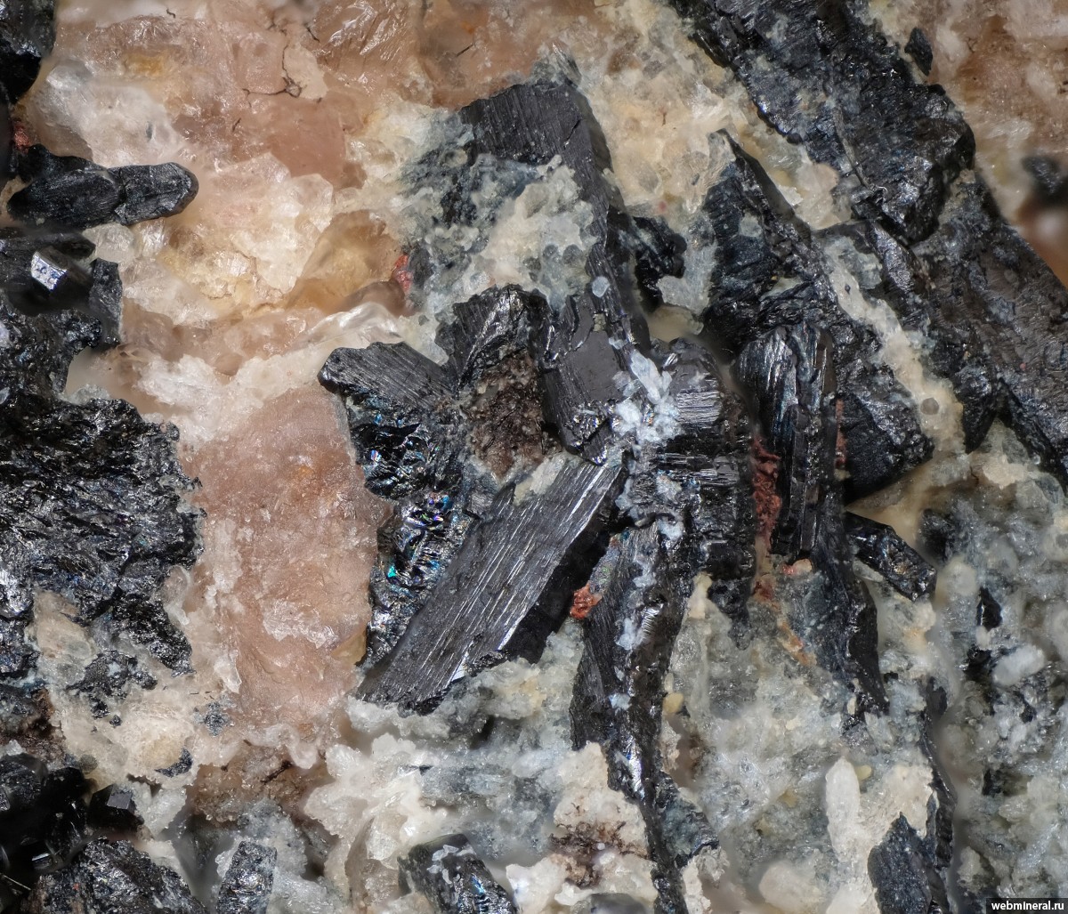 Прожилок колумбита, псевдоморфозы по пирохлору и мелкие, до 1 мм., кристаллы на стенке полости в розовом полевом шпате. Сборы 2015 г.