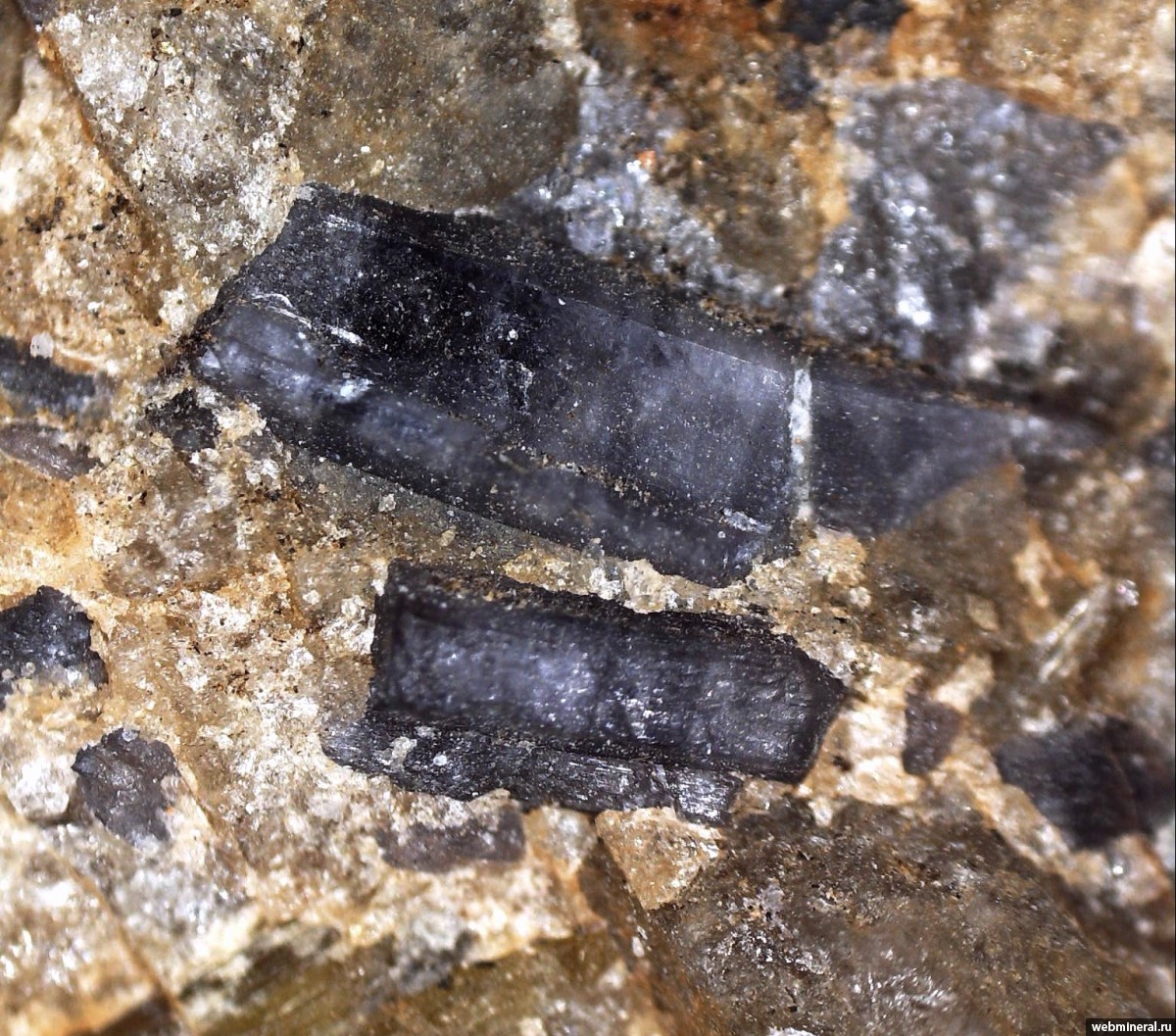 Кристаллы синевато-серого турмалина в пегматитовой породе. До 2018 года считался оленитом, но после пересмотра номенклатуры группы турмалина передиагностирован Касаткиным А.В. как алюминооксироссманит. В составе кристаллов присутствует небольшие участки по составу соответствующие принсиваллеиту.