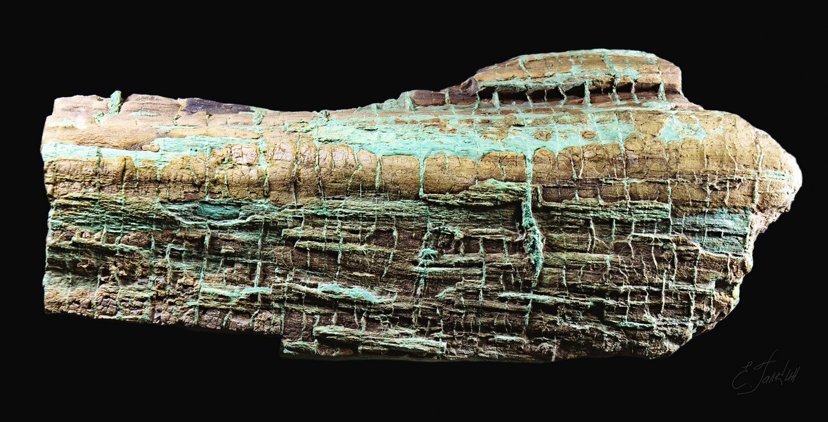 Агрегат скрытокристаллического малахита развитый в трещинах ствола ископаемой древесины.