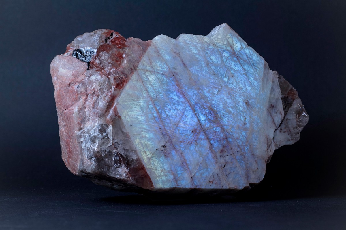 Полированный срез кристалла олигоклаза с яркой иризацией.
