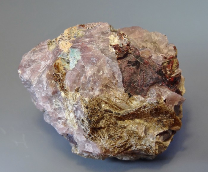 Зерно (разм. 8 мм) тугтупита необычного голубого цвета в розовом уссингите. Также в образце присутствуют темно-красный виллиомит, желтый чешуйчатый борнеманит и коричневый ломоносовит и оранжевый серандит. Находка - конец 1980-х годов.