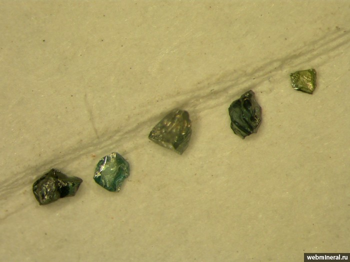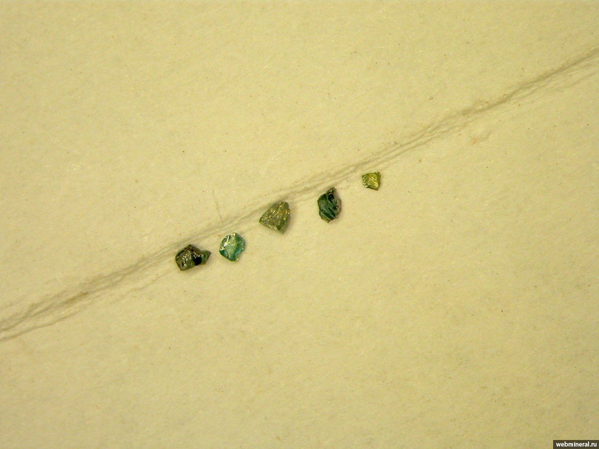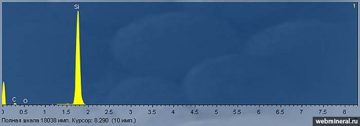 Фрагменты кристаллов муассанита различной окраски (часто зональной) из тяжёлого концентрата, отобранного из одного из притоков в верховьях реки Кошмансай. Энергодисперсионный спектр оливкового фрагмента. Сборы 80-х годов.