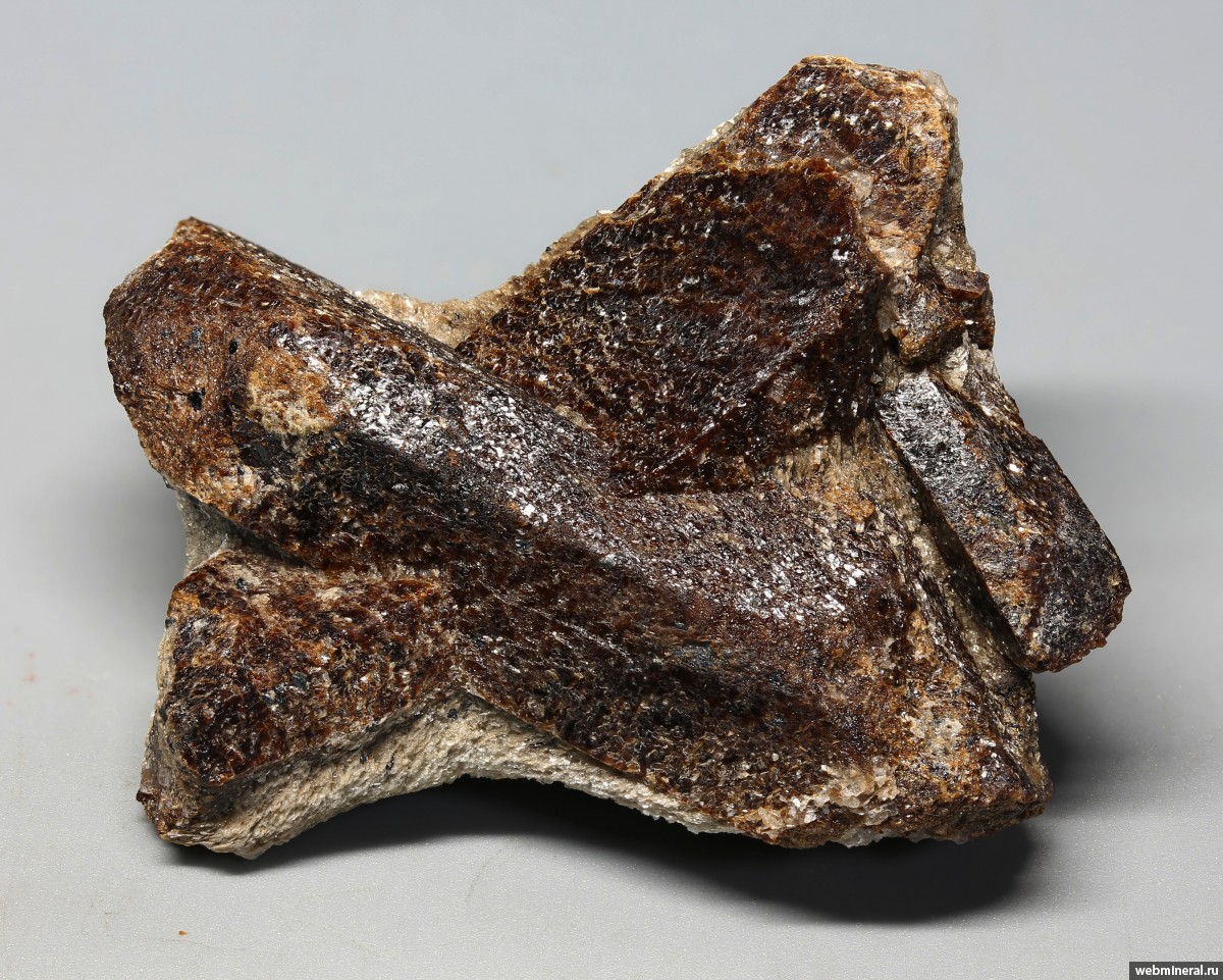 Двойниковый сросток (косой крест) коричневого ставролита из светлого слюдяного сланца. Остатки чешуйчатого мусковита видны в периферических частях образца.