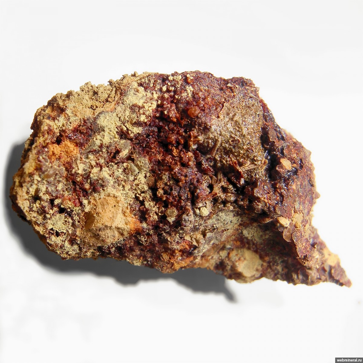 Сферолиты (до 2 мм), пленки и примазки ярко-желтого натроярозита встречаются в полостях верхней зоны лимонитовой коры. Агрегаты натроярозита располагаются на поверхности стекловидной массы аморфного водного фосфатистого гидроокисла железа, выполняющего пространство между обломками осадочной породы и отличающегося глубокими вишневыми рефлексами. В этих полостях натроярозит соседствует с "псевдоморфозами" бронзового и оранжевого цвета, представляющими собой "чехольчики" фосфатистого гидроокисла железа поверх нацело выщелоченных кристаллов вивианита до 3 мм. Несмотря на низкое содержание фосфора, эти псевдоморфозы внешне не отличимы от известных образцов сантабарбараита с других местонахождений.