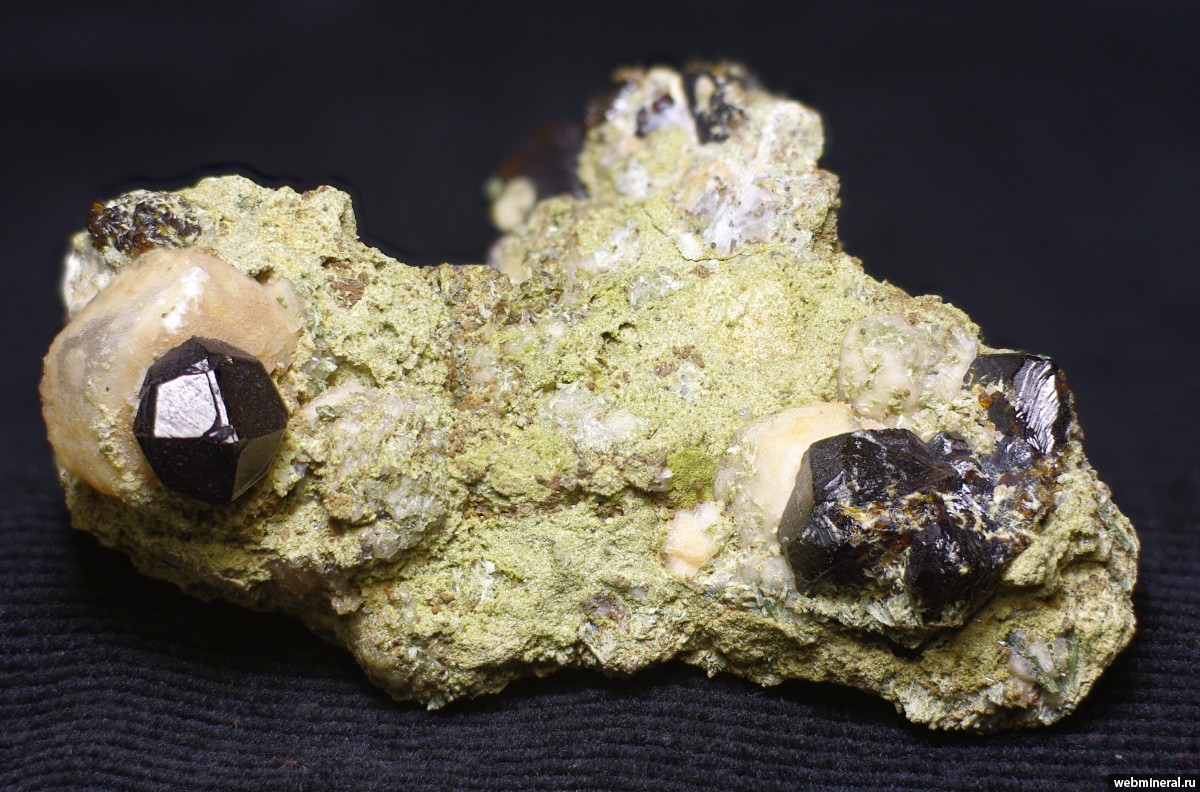 Кристаллы коричневого андрадита, размером около 1 см с кальцитом и геденбергитом.