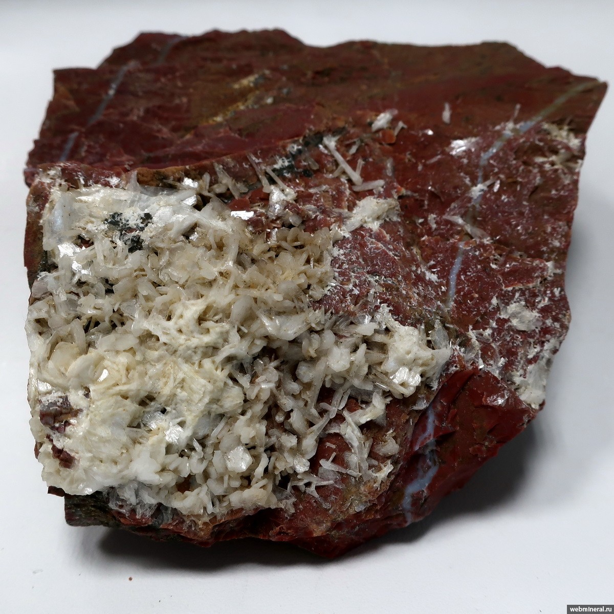 Сростки молочно-белых пластинчатых кристаллов стильбита-Са размером до 5 мм в трещине темно-красной яшмы. Сбор: 1968 г., Полканов Ю.А.