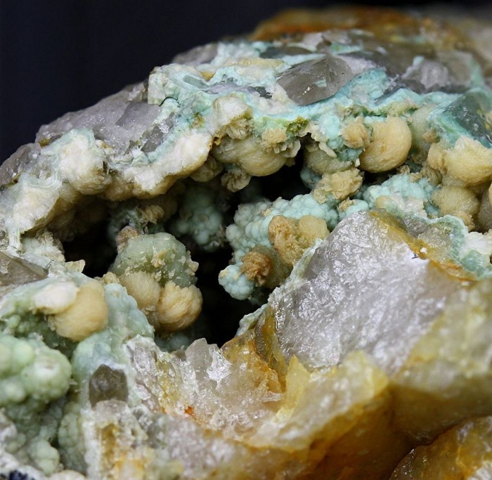 Сферолиты желтоватого крандаллита на корочке голубоватого планерита, покрывающего стенки пустот в кварце. Сборы 2011 год.