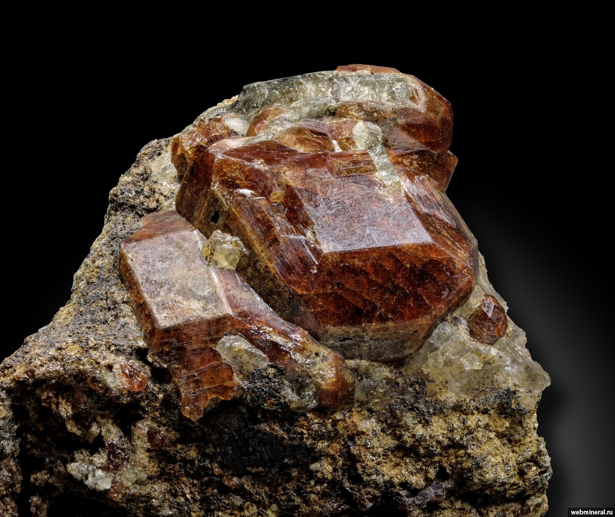 Сросток кристаллов красно-коричневого гроссуляра размером до 15 мм и фрагменты кристаллов сероватого клиноцоизита на скарновой породе. Из коллекции М.Л. Учителя.