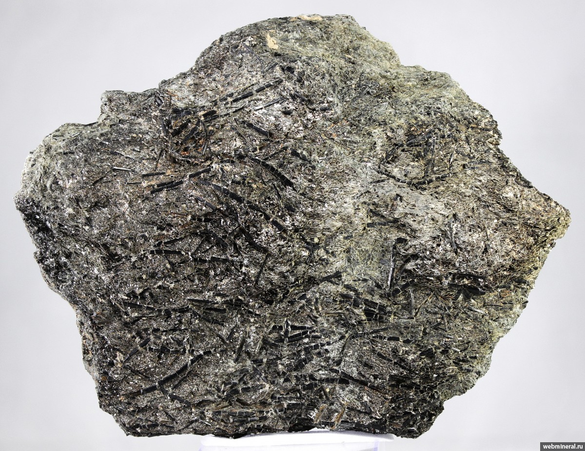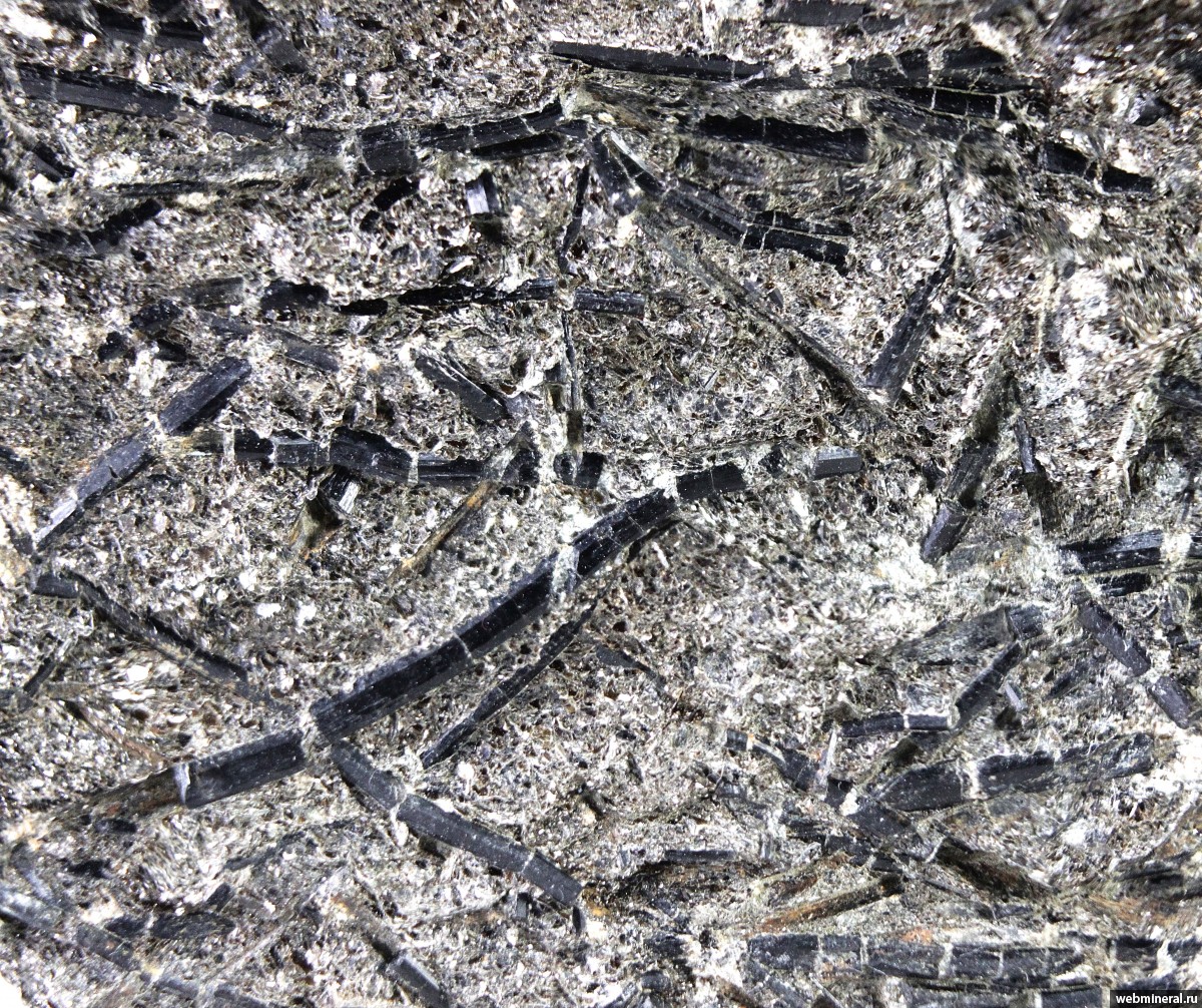 Деформированные и разорванные кристаллы дравита в кварц-турмалин-флогопитовом сланце. Общий вид образца (размер 20х16х4 см) на дополнительном фото.