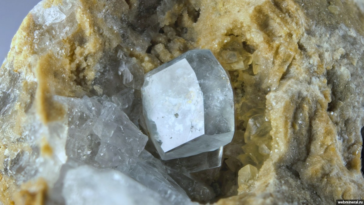 Голубоватый прозрачный хорошо образованный кристалл целестина на известняке с желтым кальцитом.