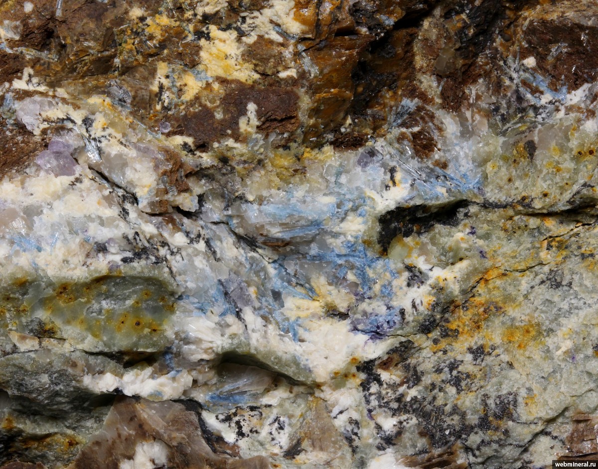 Богатая вкрапленность тонкопризматических кристаллов голубого берилла в метасоматите сложенном мелкочешуйчатым зеленовато-серым мусковитом, фиолетовым флюоритом, коричневым карбонатом, белым полевым шпатом и др. Находка - 2025 год.