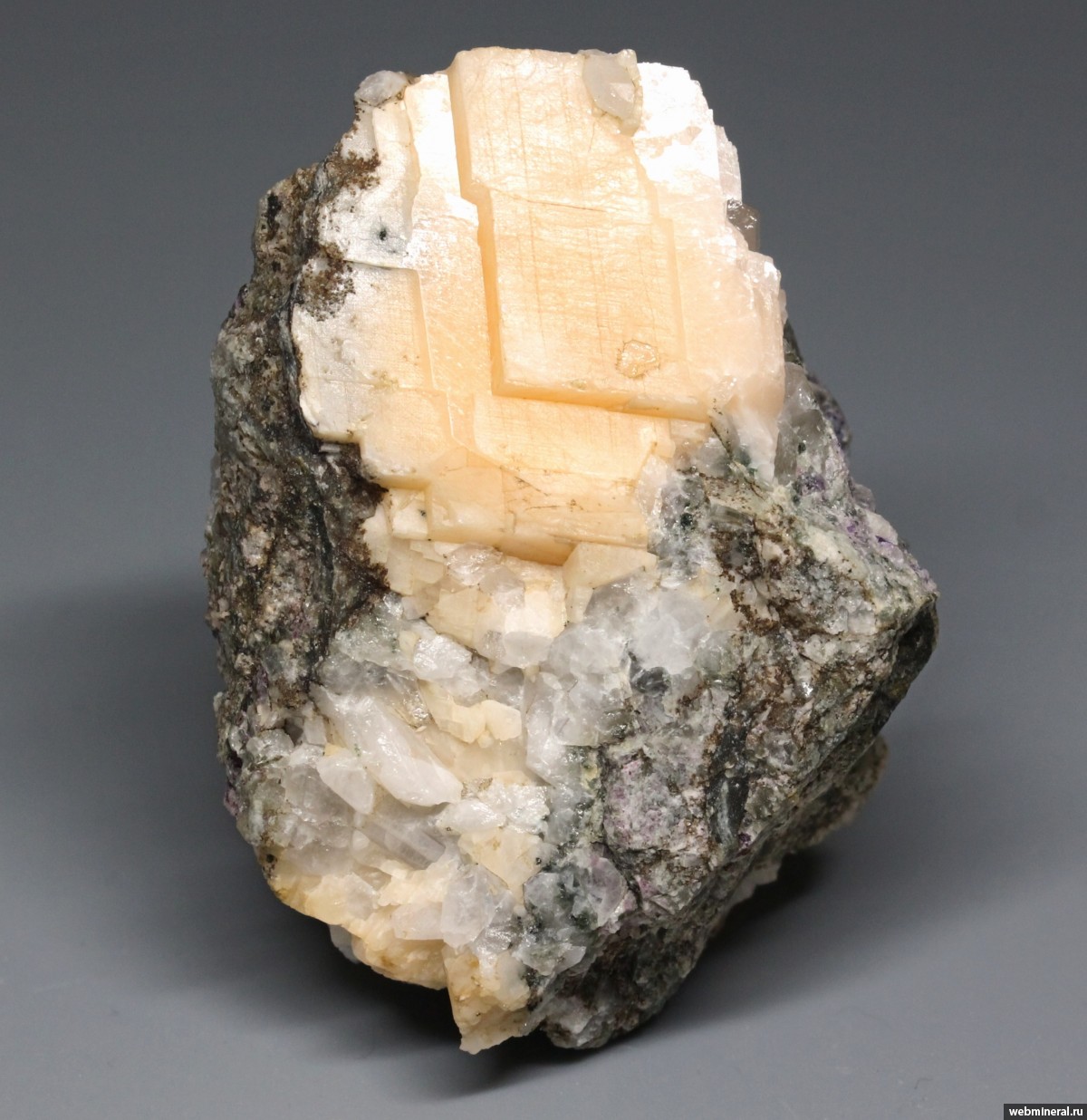Прожилок в грейзенизированной вмещающей породе сложенный крупнокристаллическим желтоватым кальцитом и светло-серым кварцем. В массе кальцита "плавают" редкие игольчатые кристаллы бесцветного берилла.