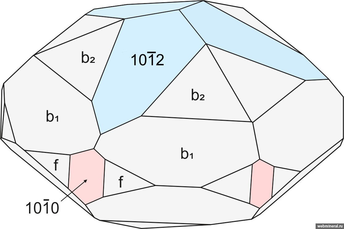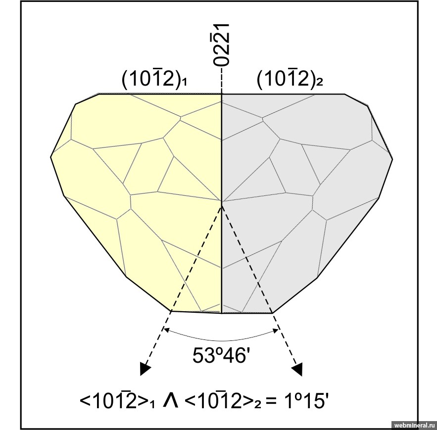 Двойник срастания кальцита по острому отрицательному ромбоэдру (02-21). Идеализированная форма сдвойникованных кристаллов и двойника на дополнительных рис.