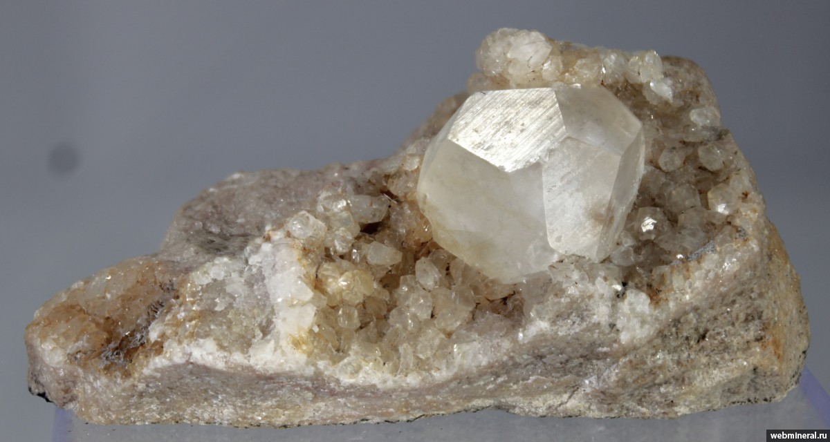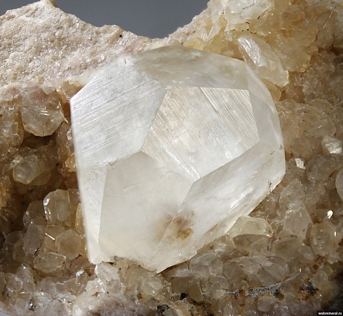 Кристалл кальцита (комбинация гексагональной призмы и отрицательного ромбоэдра) на стенке полости в доломите.