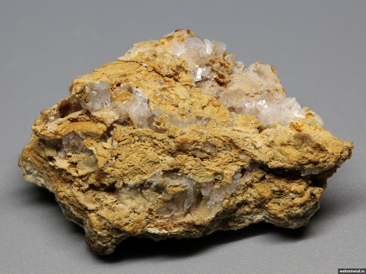 Кавернозные агрегаты коричневато-желтого цвета, сложенные сложной смесью арсенатов, стенки пустоток в которых инкрустированы мельчайшими (размером до 30 микрон) кубическими кристалликами кальциофармакоалюмита. Кальциофармакоалюмит тесно ассоциирует с прожилками бесцветного гипса, белым лучистым владимиритом (на фото не виден), мелкими сферолитиками тонкоигольчатого белого тапиаита (на фото не различим) и другими арсенатами.