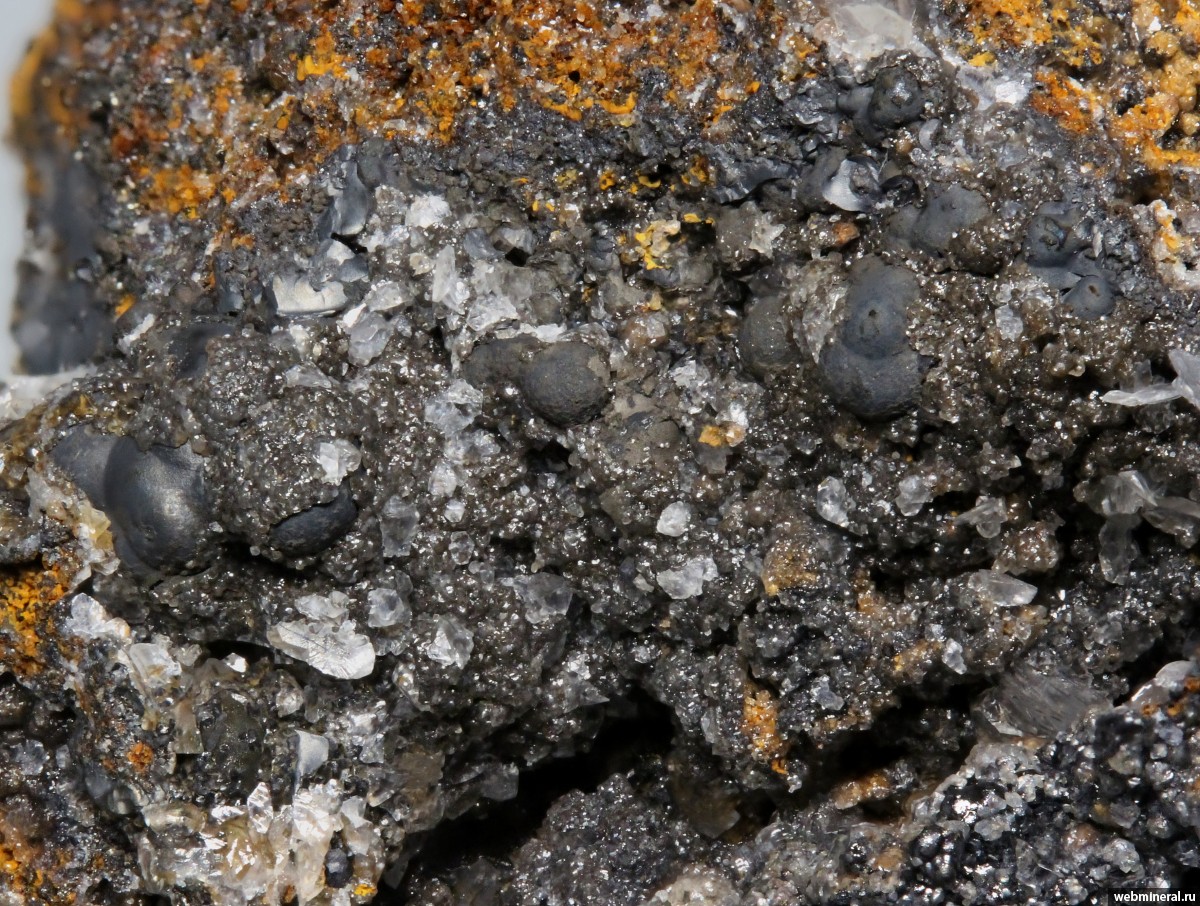 Сферолитовая корка черного гидрогетеролита, покрытая мелкими прозрачными расщепленными кристалликами смитсонита и более крупными пластинчатыми кристаллами белого кальцита. Находка - 2025 год.