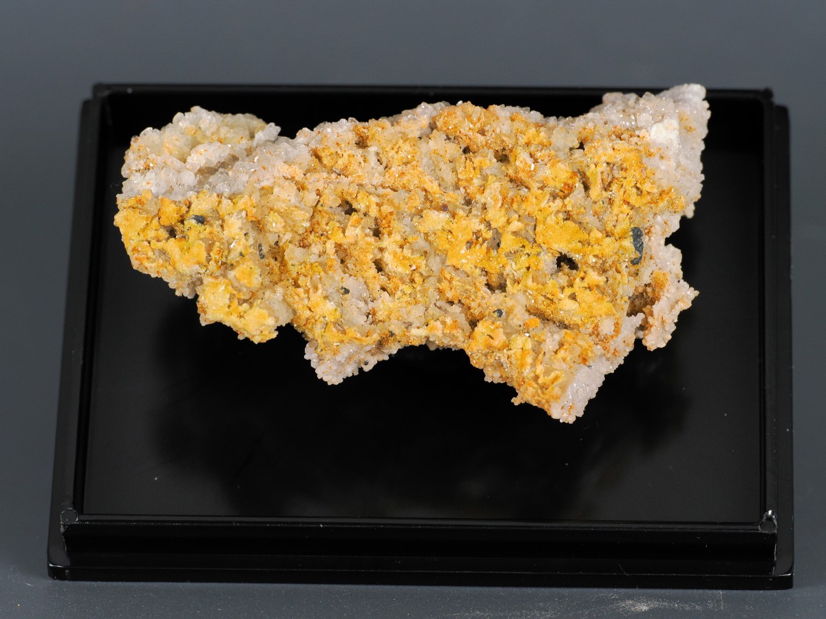 Ярко-желтые до 20 мкм кристаллы биверита - (Cu) на пластинчатых кристаллах барита с кварцем.