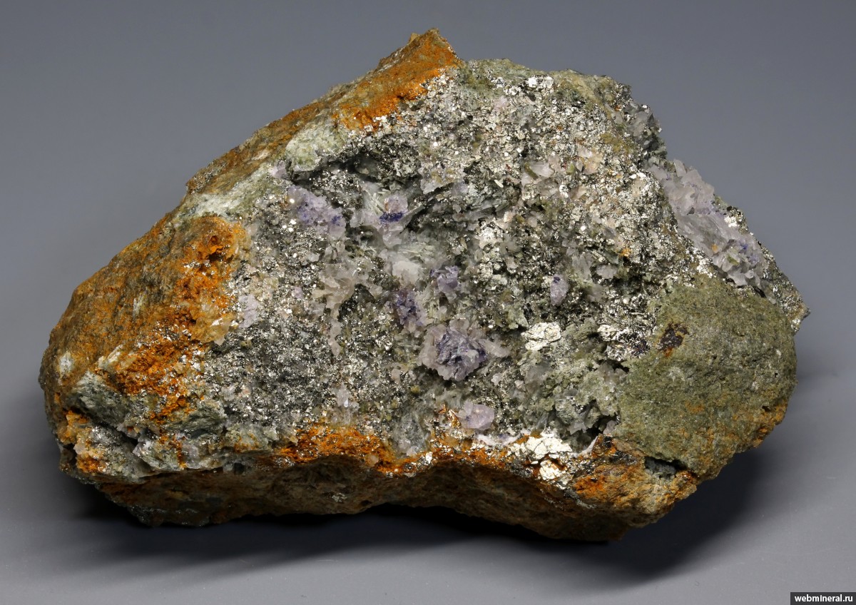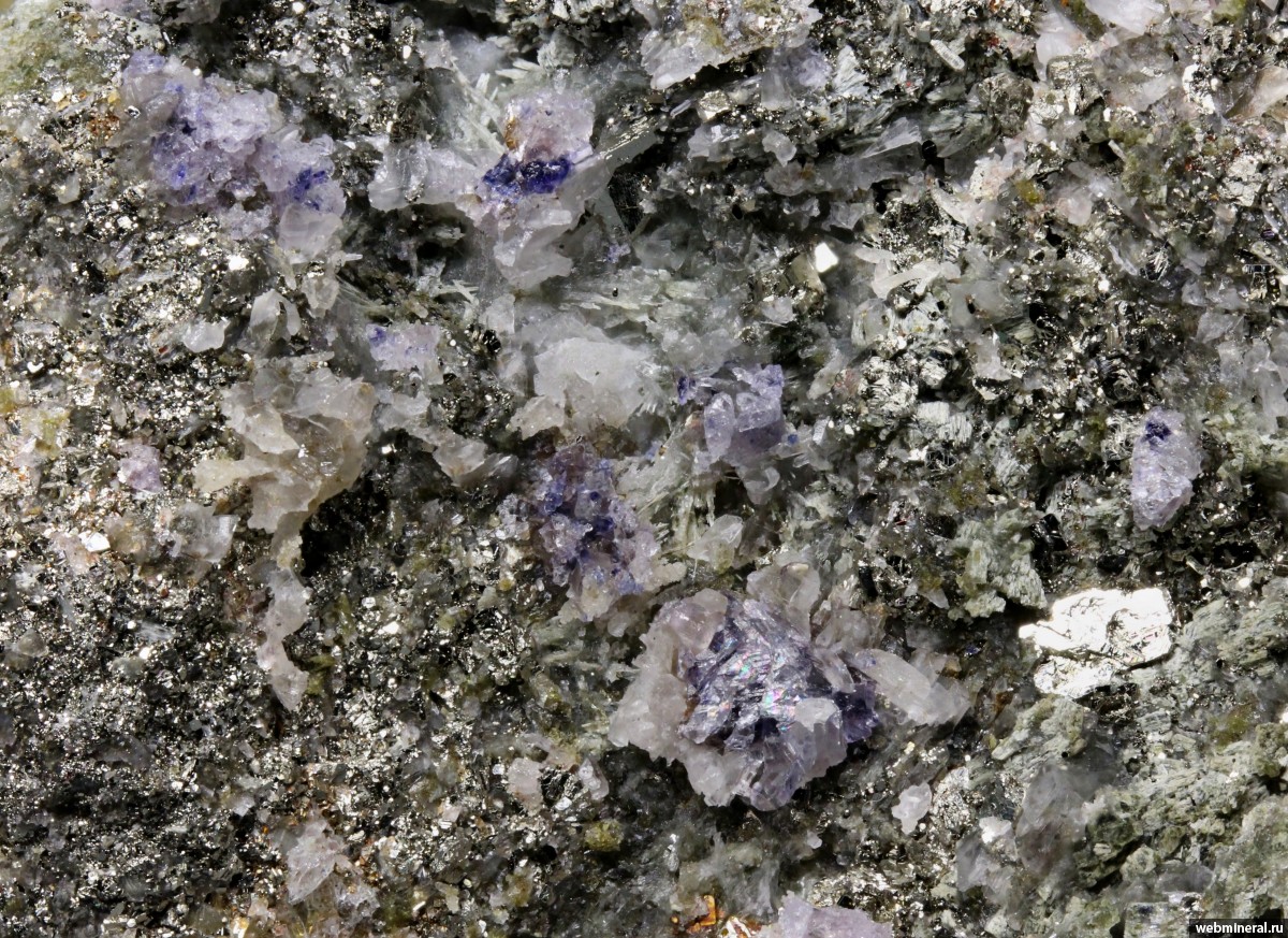 Неправильной формы кристаллы сиреневого флюорита и мелкокристаллический пирит на стенке растворенного кальцитового прожилка в сульфидной руде. Находка - 2025 год.