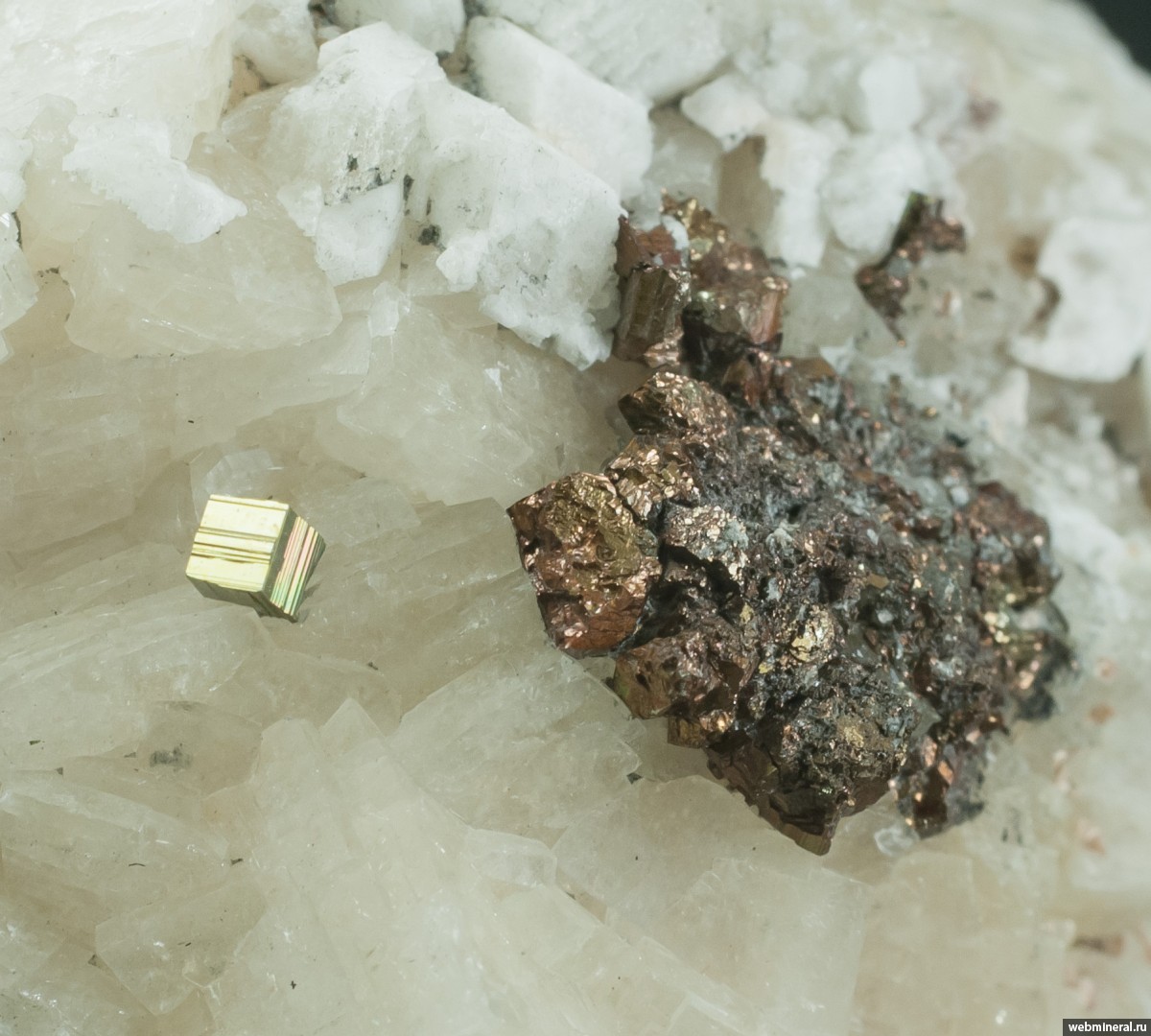 Уплощенный сросток плохообразованных кристаллов халькопирита и отдельный кристалл пирита на доломите. Белые кристаллы сверху - кальцит
