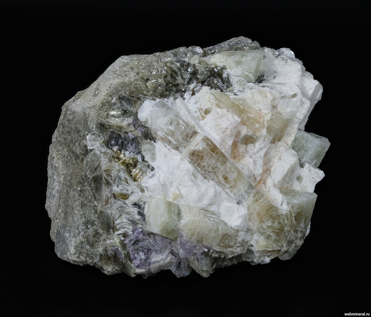 Призматические кристаллы желтоватого берилла длиной 1-2 см в тонком кварц-мусковит-полевошпатовом прожилке.