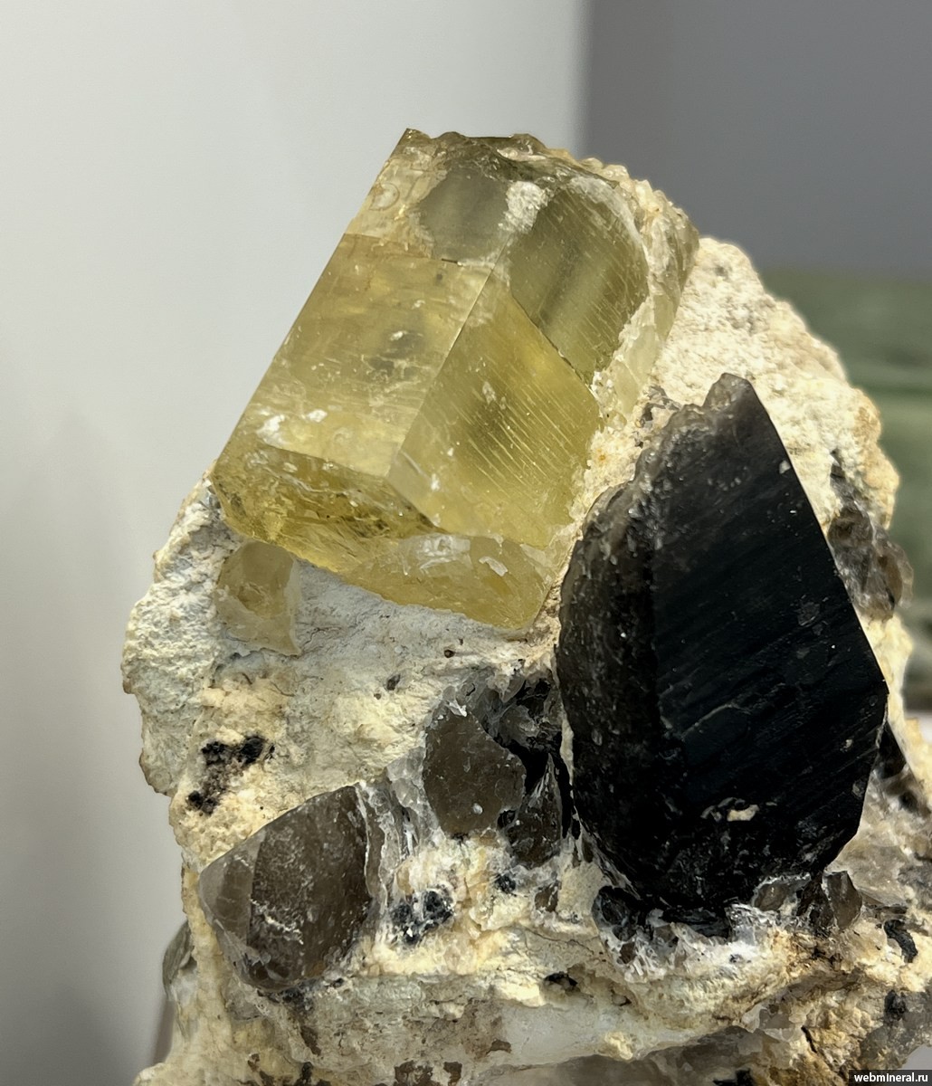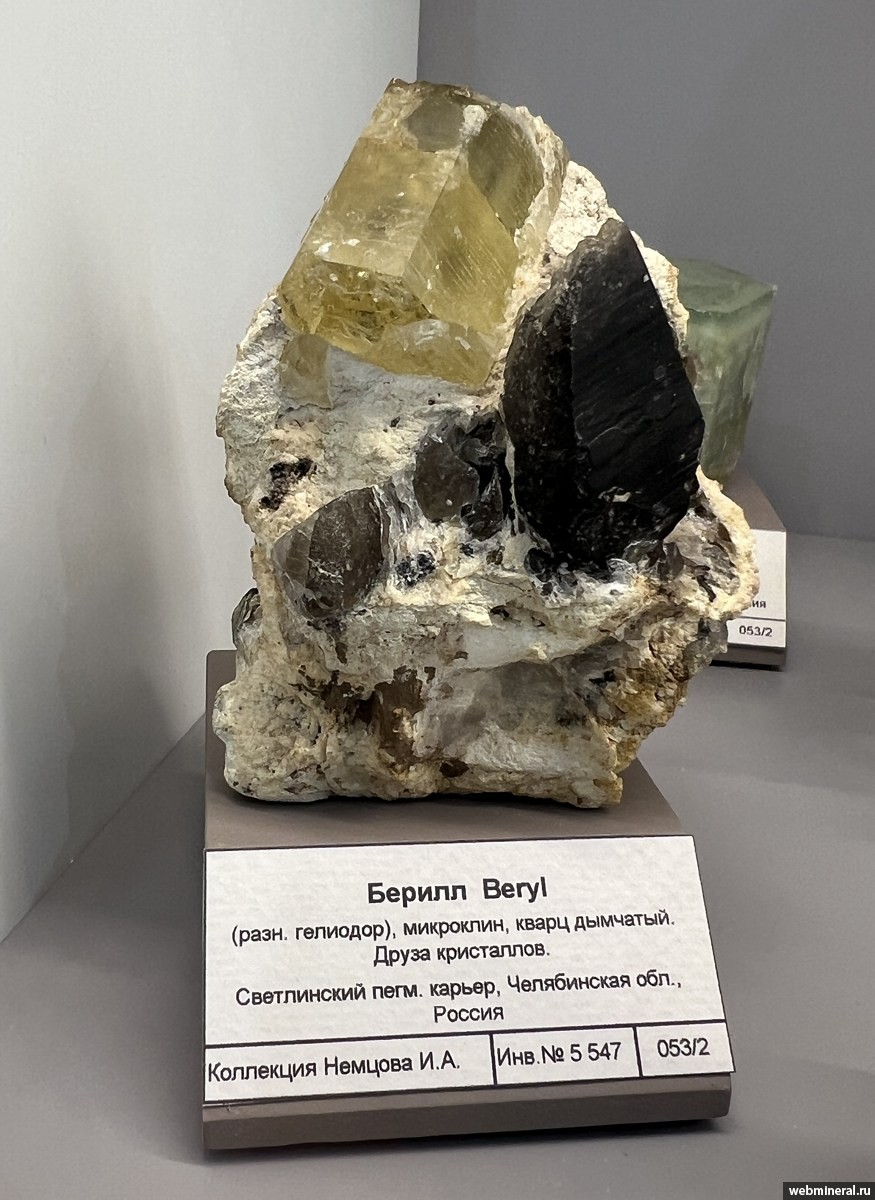 Прозрачный кристалл желтого берилла на микроклине с дымчатым кварцем. Образец из коллекции Немцова И.А.