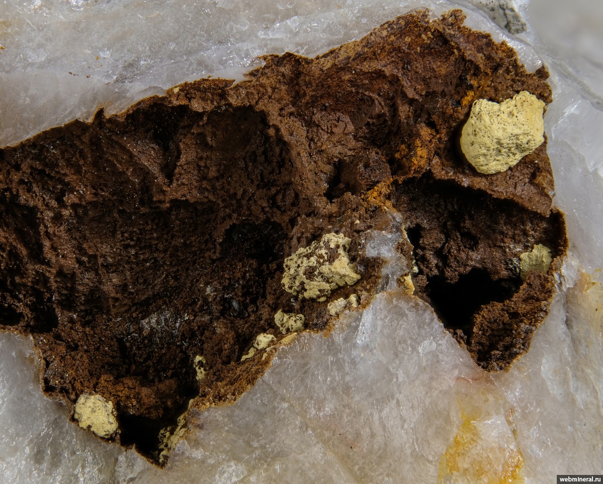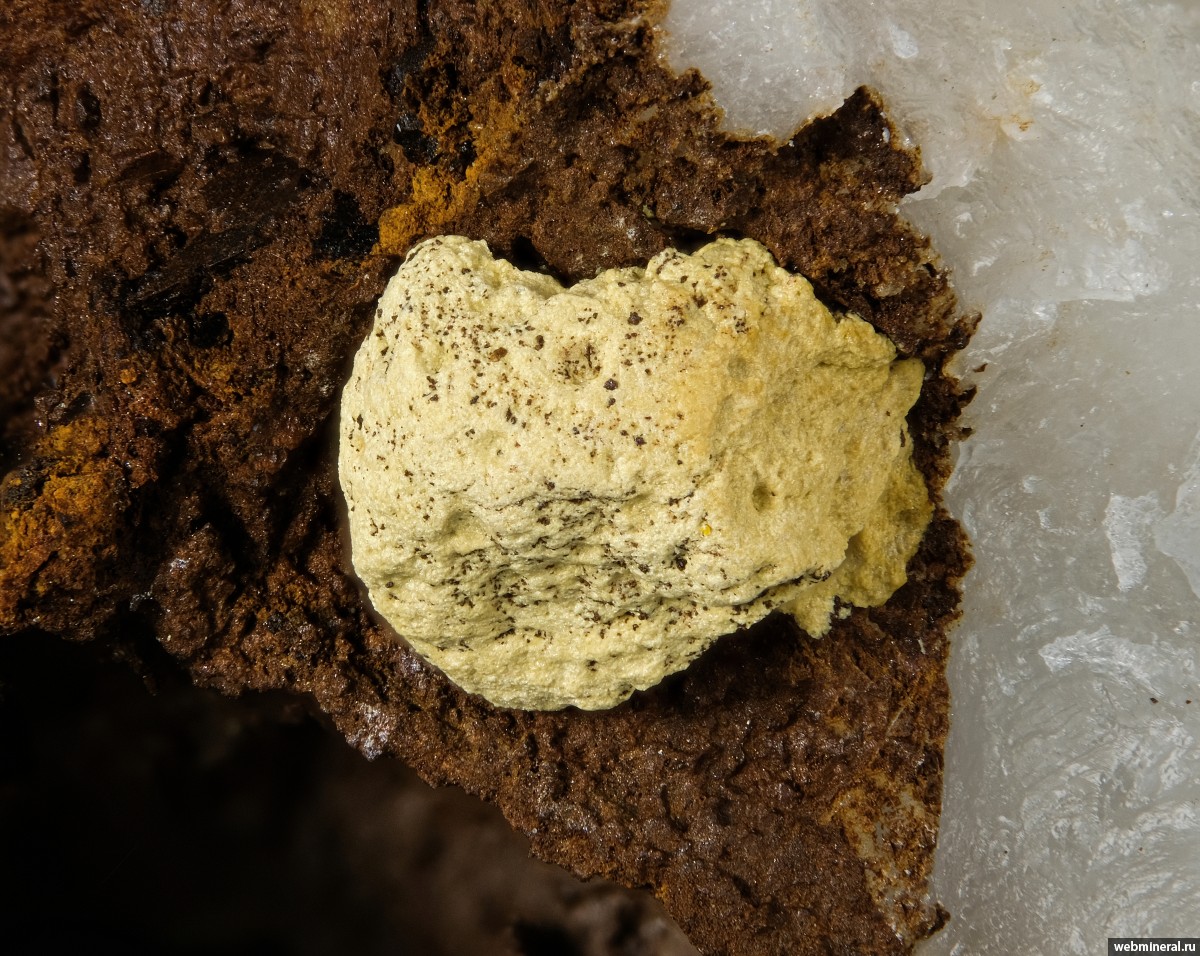 Округлые комочки желтого натроярозита (размером около 2 мм) на стенке каверны в кварце.