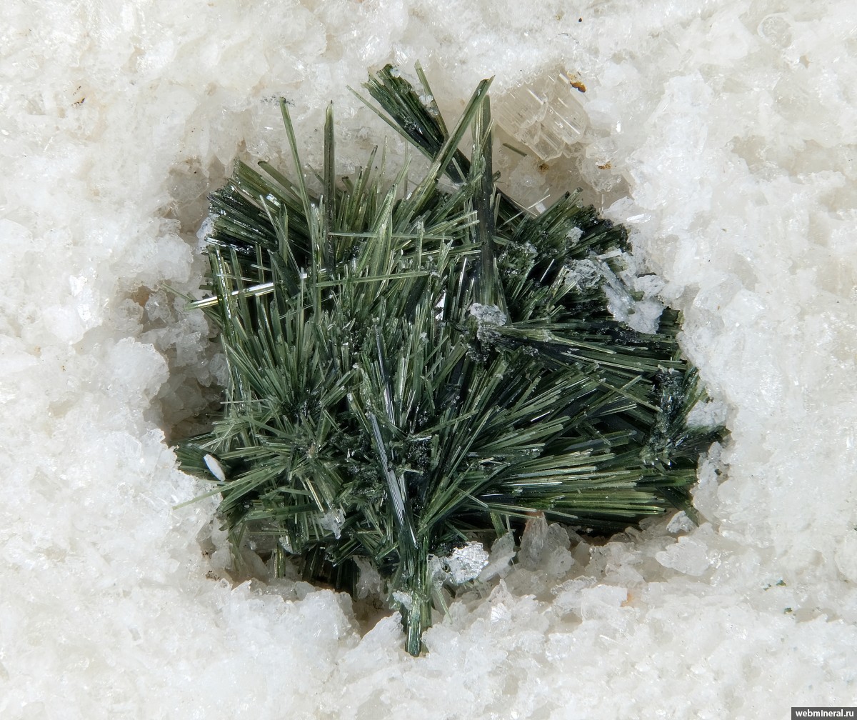 Тонкоигольчатые кристаллы зелёного эгирина (размер сростка – 4 мм) в альбите. Находка - август 2025 года.