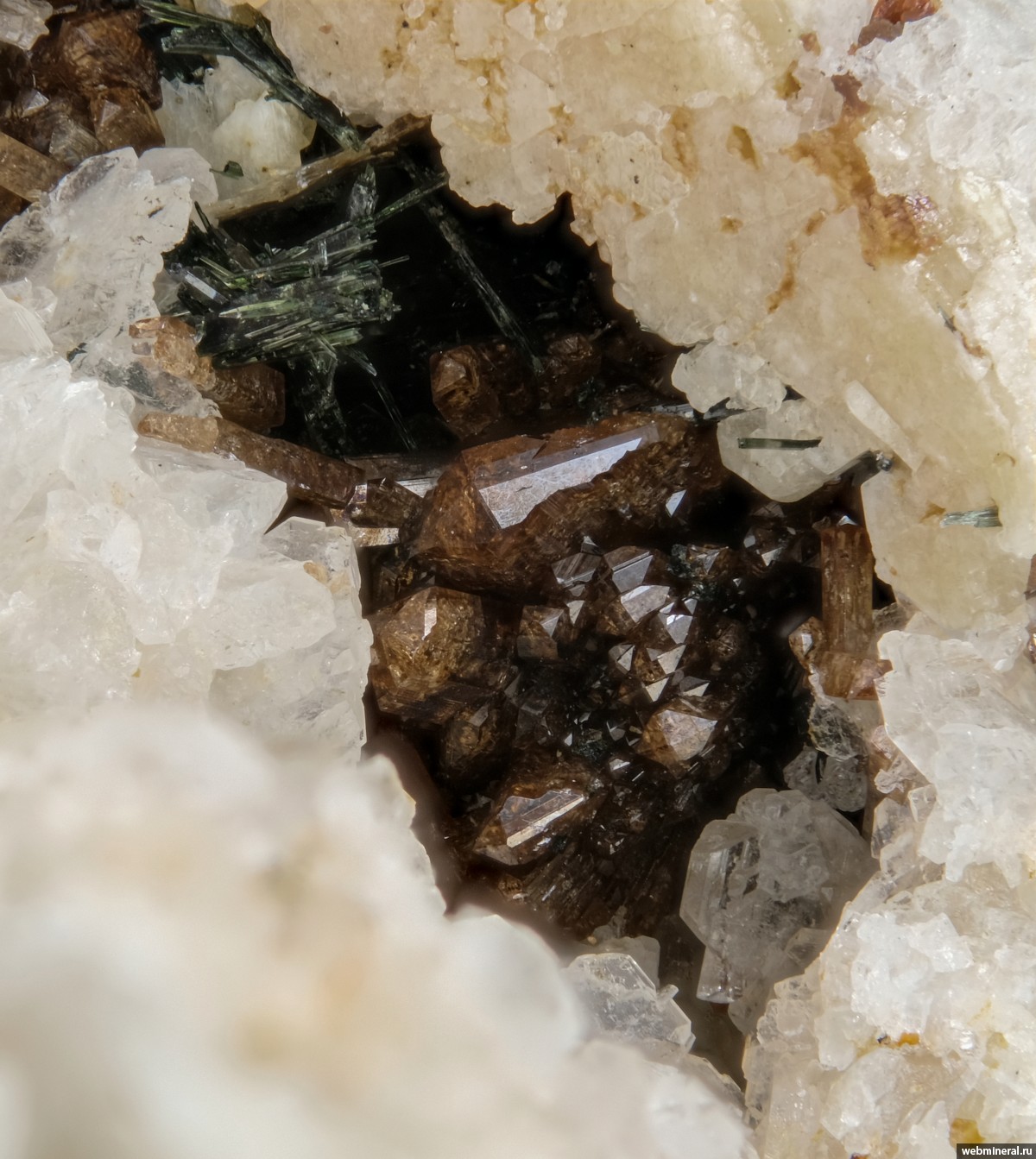 Фото 1: Радиально-лучистый сросток кристаллов коричневого лоренценита в альбите (поле зрения - 9 мм). Фото 2: то же в КВ УФ 254 нм. Фото 3: сросток кристаллов лоренценита в каверне длиной 5 мм. Фото 4: сросток кристаллов лоренценита размером 2 мм. Фото 5: общий вид образца. Находка - август 2025 года.