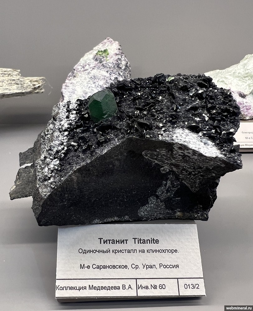 Кристалл титанита высотой около 1,3 см с клинохлором на хромите. Образец из коллекции Медведева В.А.
