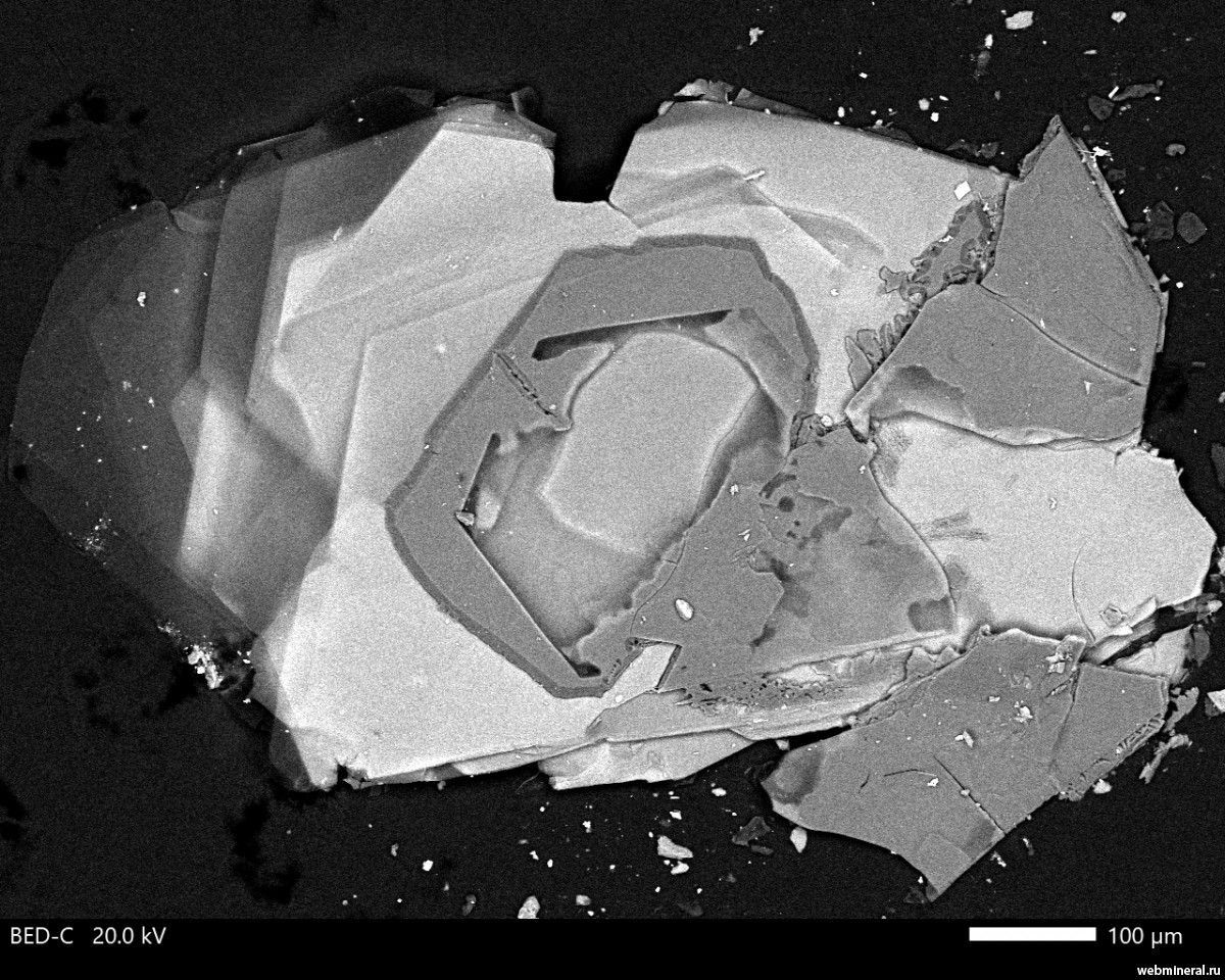 Эпитаксический (возможно синтаксический) сросток светлого карчевскиита и тёмного квинтинита (политип 1М). Фото в обратно отраженных электронах. Сбор - Бабуров К.В.