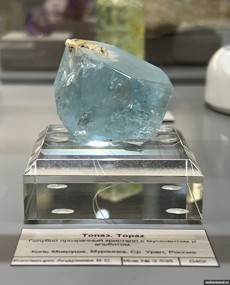 Голубой прозрачный кристалл топаза с мусковитом и альбитом. Образец из коллекции Андреева В.С.