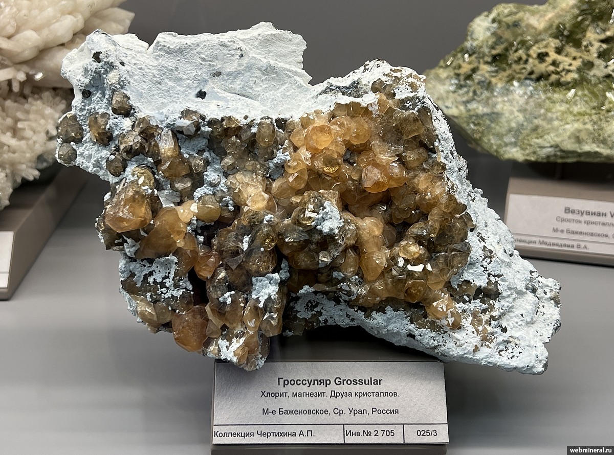 Друза кристаллов гроссуляра размером до 2 см с хлоритом и магнезитом. Образец из коллекции Чертихина А.П.