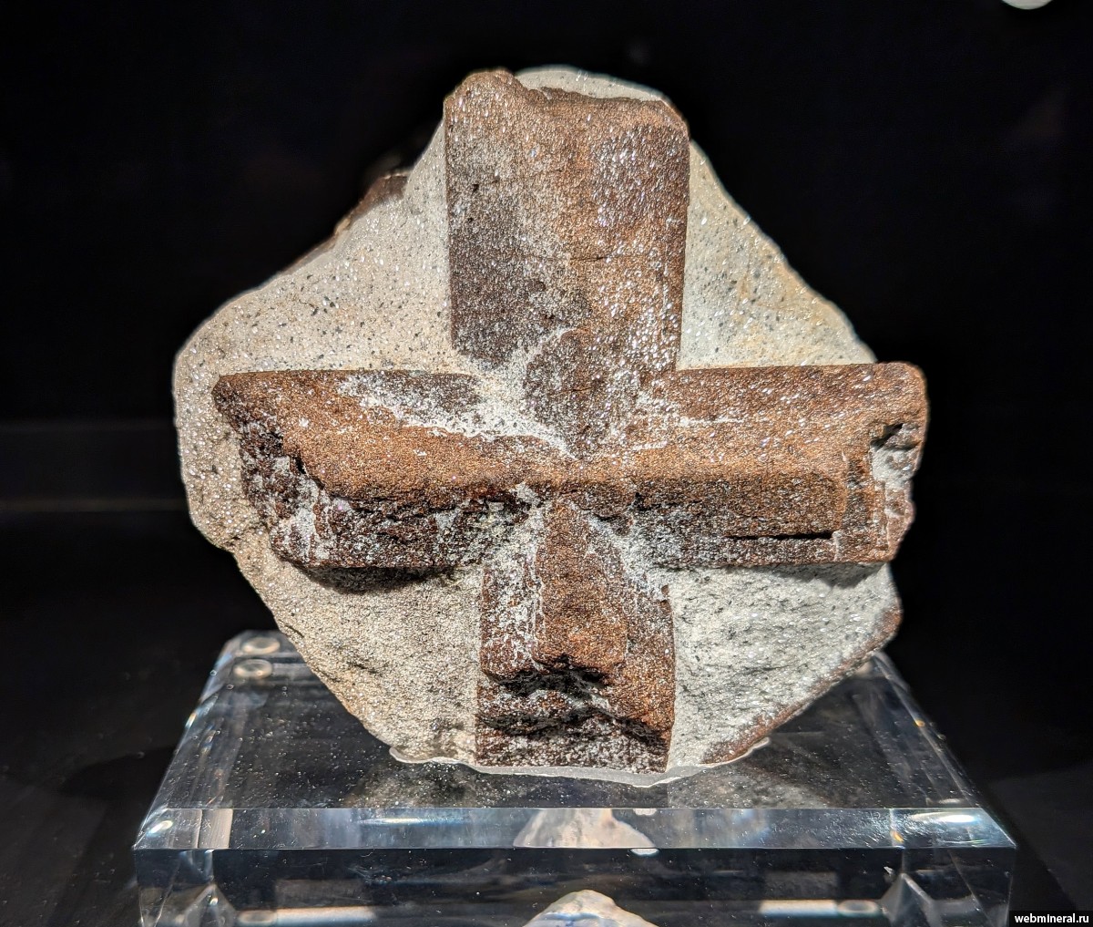 Двойниковый стросток ставролита в светлом слюдяном сланце. Это самый крупный из достоверно известных на сегодняшний день "прямой крест" ставролита. Фото - декабрь 2025 г. Выставка "Минерал и Коллекционер. Единство непохожих". ГГМ им. В.И.Вернадского РАН.