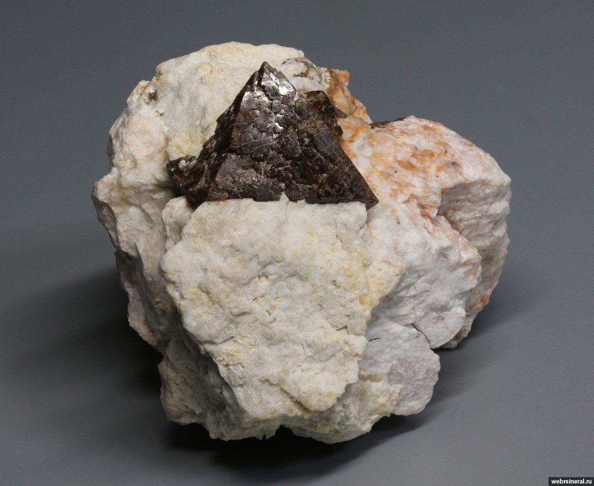 Крупный (22 мм по ребру) октаэдрический кристалл коричневого циркона в полностью замещенном светлым натролитом нефелине с перламутровыми пластинчатыми кристалликами гиббсита, заполняющими мелкие пустоты в натролите. Находка - 2022 год.