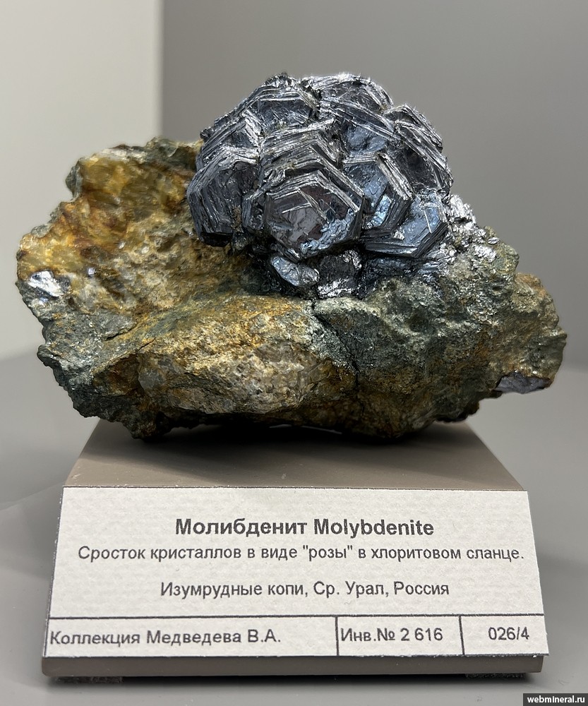 Сросток кристаллов молибденита в виде "розы" шириной около 4,5 см в слюдистом метасоматите. Образец из коллекции Медведева В.А.