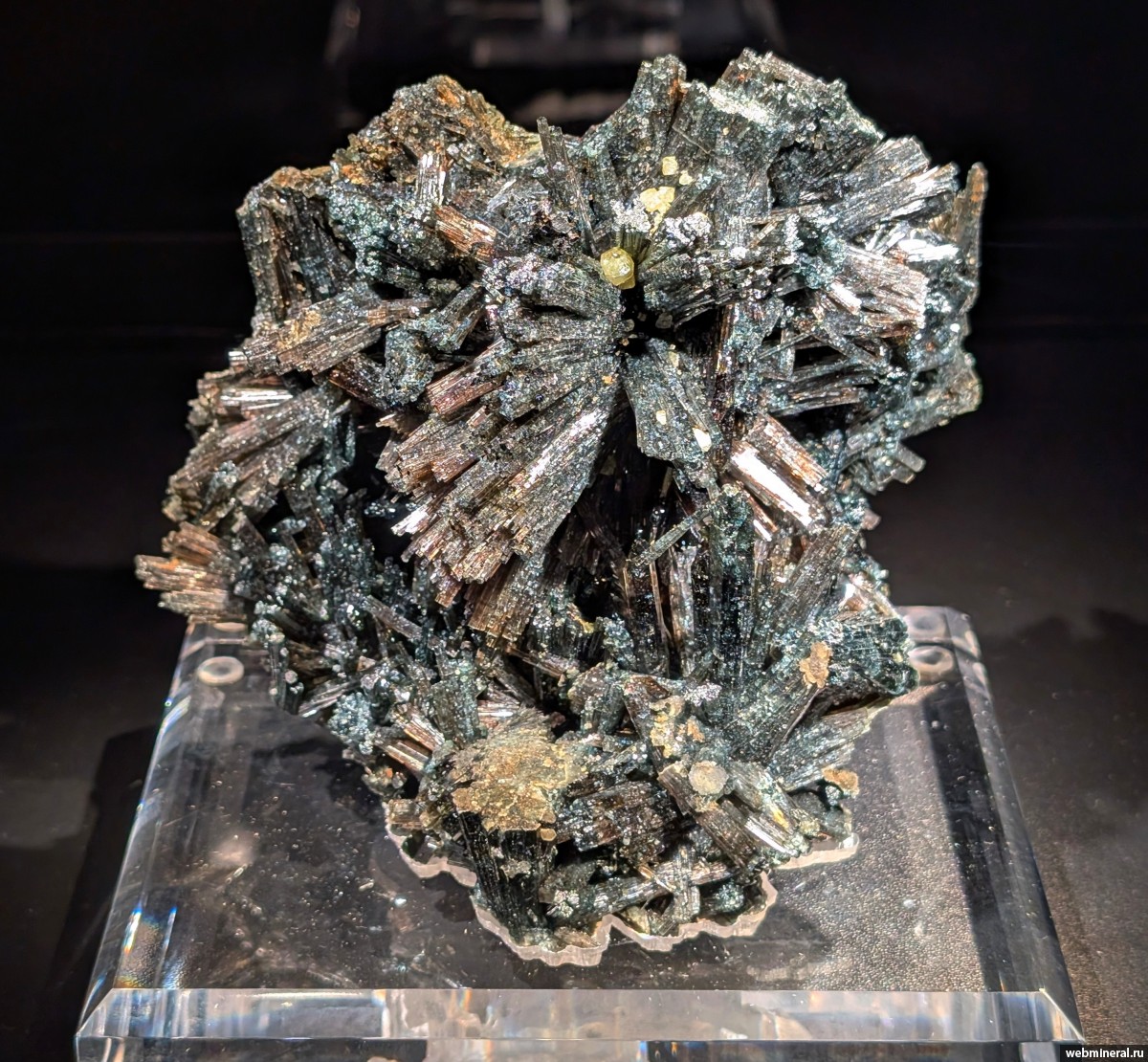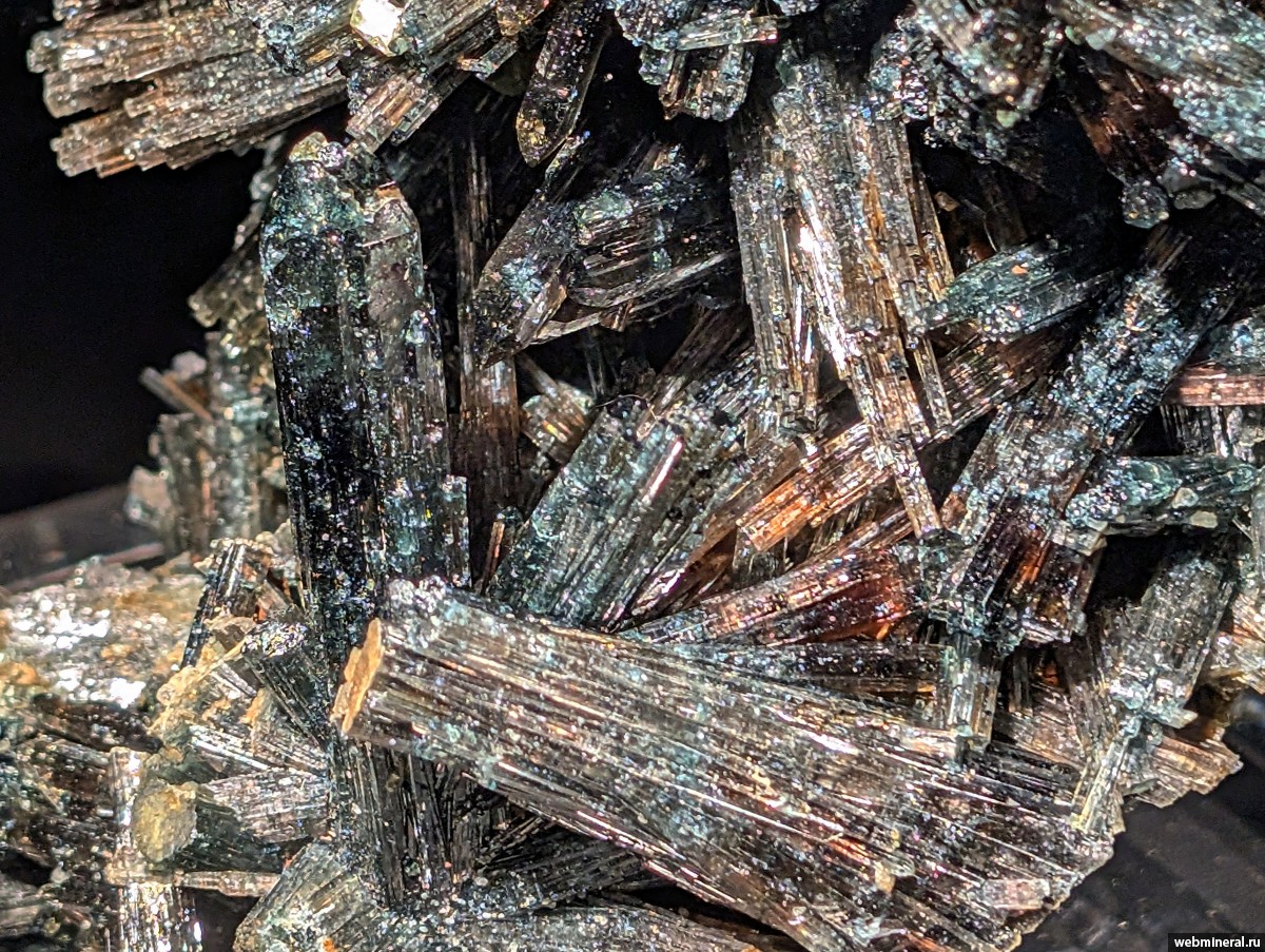 Друза полихромных (от светло-коричневого и голубоватого до темно-коричневого и густо-синего) тонкопризматических кристаллов дравита длиной до 5,5 см. На дравит нарастают редкие таблитчатые кристаллы желтого гидроксиапатита. Кристаллы дравита отчетливо меняют окраску в зависимости от угла падения света. Находка - 2021 год. Образец из коллекции Некрасова В.И. Фото - декабрь 2025 г. Выставка "Минерал и Коллекционер. Единство непохожих". ГГМ им. В.И.Вернадского РАН.