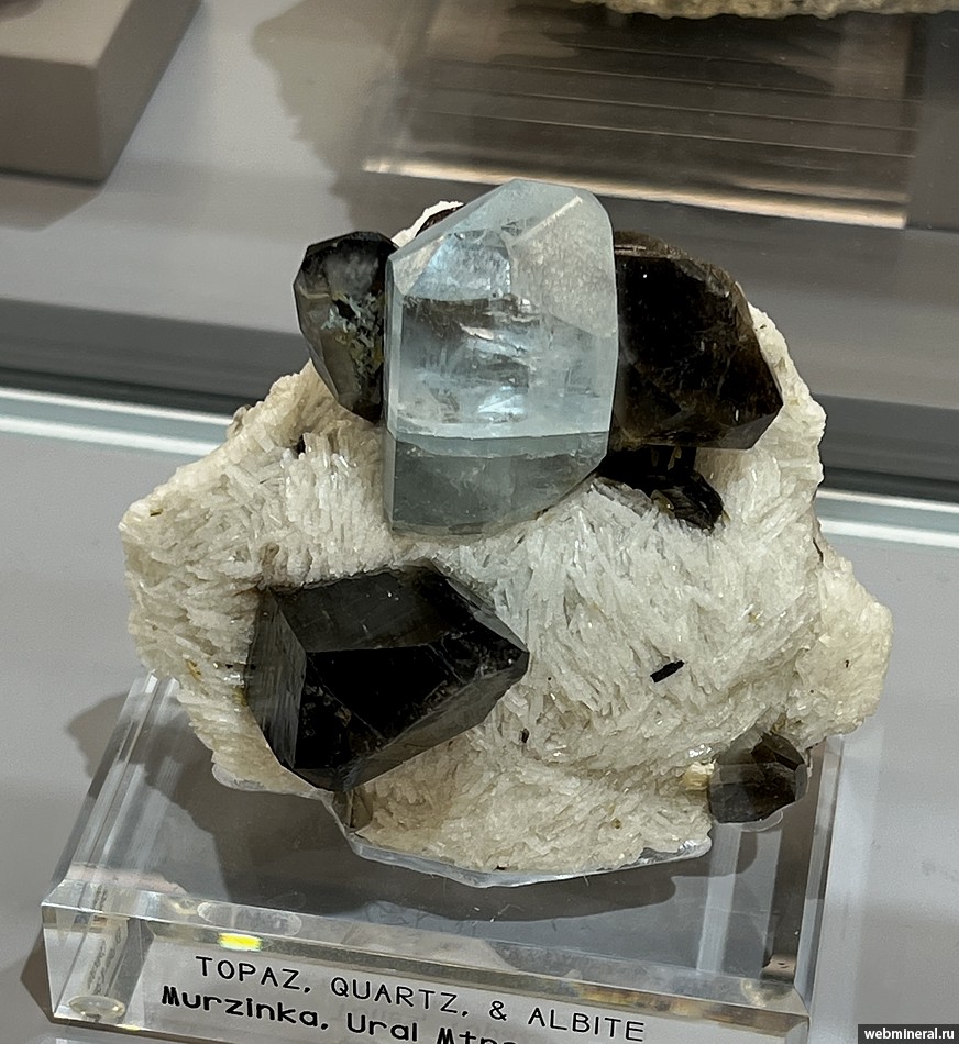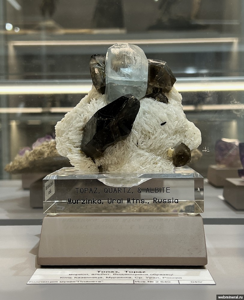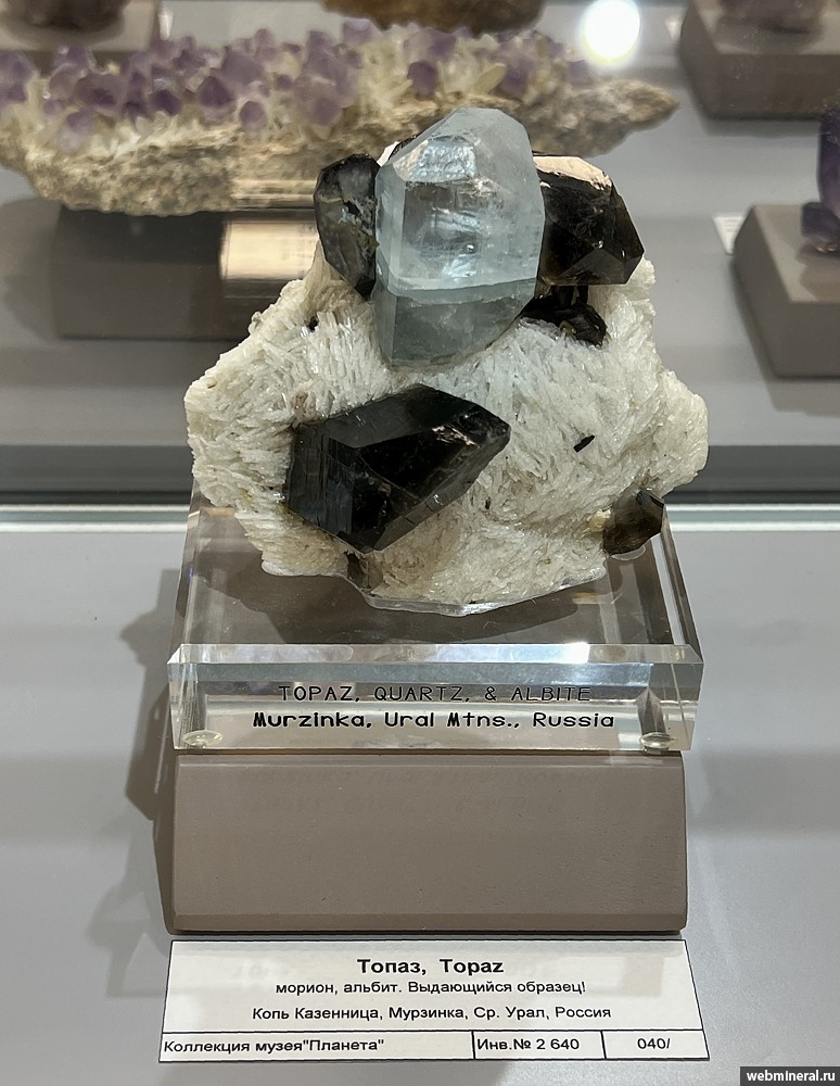 Кристалл голубого топаза высотой около 5 см с кристаллами кварца (мориона) на альбите. Образец из коллекции музея "Планета".