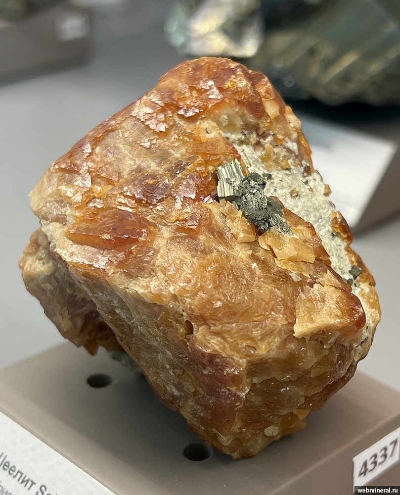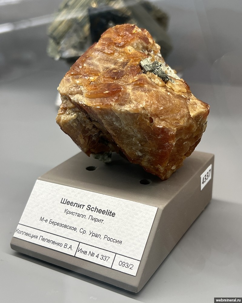 Кристалл шеелита с кристаллами пирита. Образец из коллекции Пелепенко В.А.