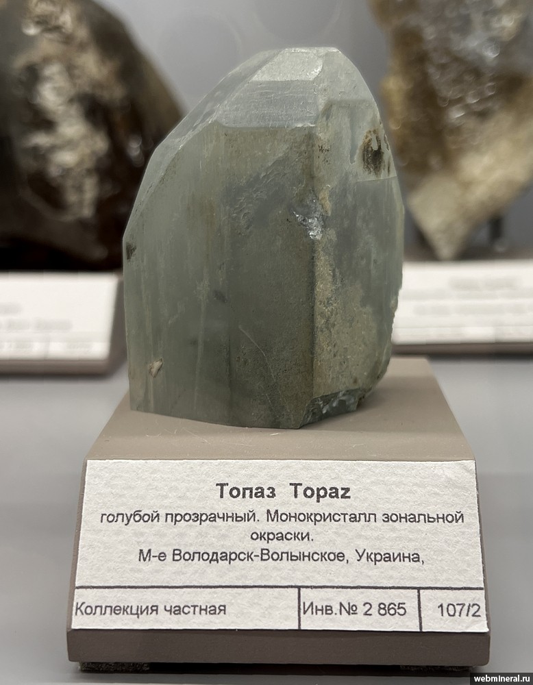 Прозрачный кристалл голубого топаза с матовой шероховатой поверхностью. Образец из частной коллекции.