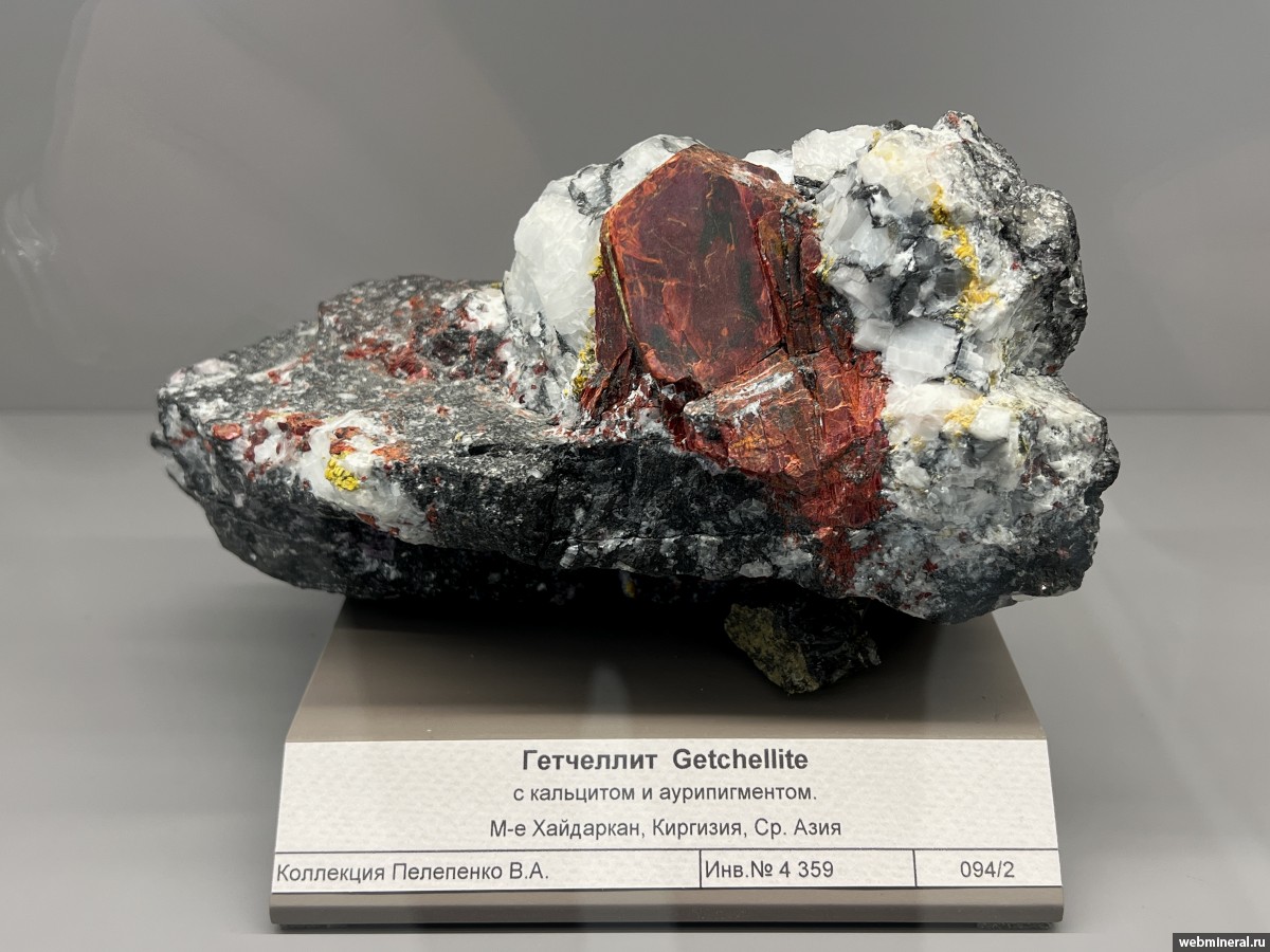 Фотография минерала Гетчеллит, Кальцит, Аурипигмент. Хайдаркан (Hg) месторождение.