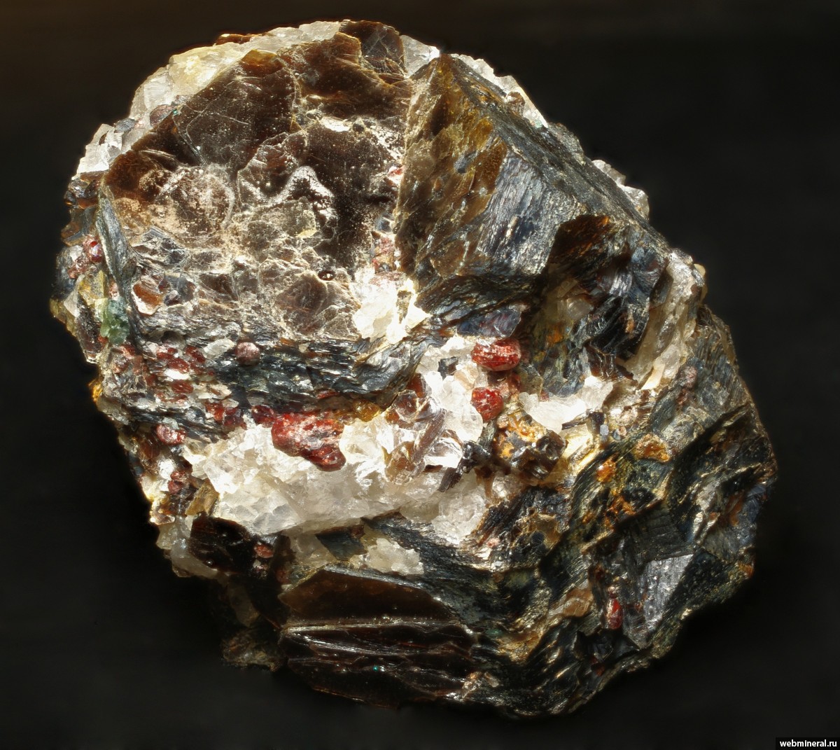 Сросток кристаллов темно-коричневого мусковита с присыпкой кристаллов красного альмандина и мелкими длиннопризматическими кристаллами светло-коричневого циркона (в центре фото). Белый минерал - кварц.