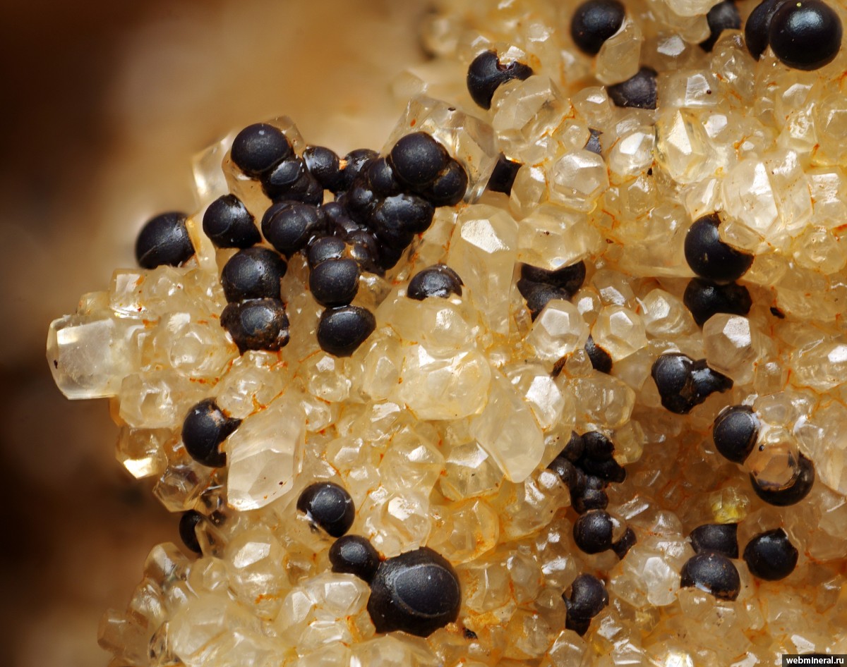 Сферолиты гетита на кристаллах кальцита в карбонатной конкреции из бокситов.