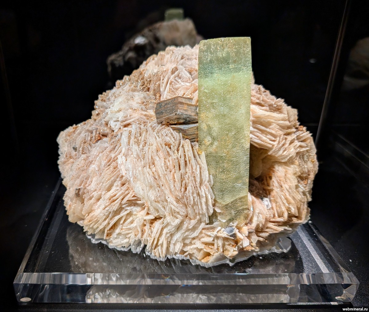 Крупный призматический кристалл бледно-зеленого берилла (размером 14 х 3 х 1,5 см) на друзе пластинчатого альбита. Коллекция Э.Г. Баяндина. Фото - декабрь 2025 г. Выставка "Минерал и Коллекционер. Единство непохожих". ГГМ им. В.И.Вернадского РАН.