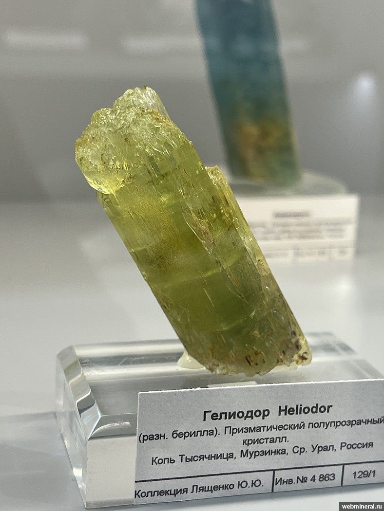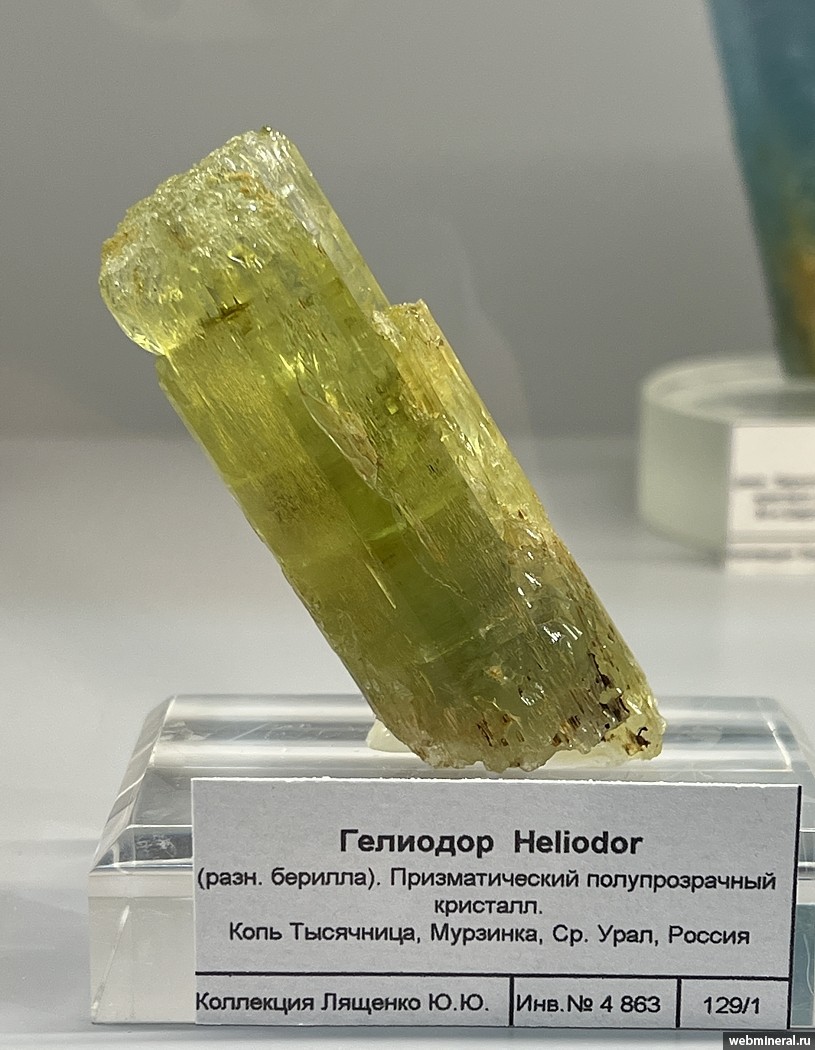 Полупрозрачный кристалл желтого берилла (гелиодора). Образец из коллекции Лященко Ю.Ю.