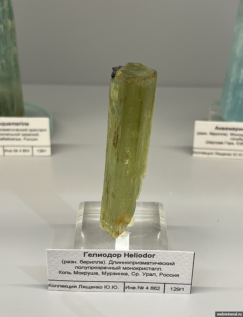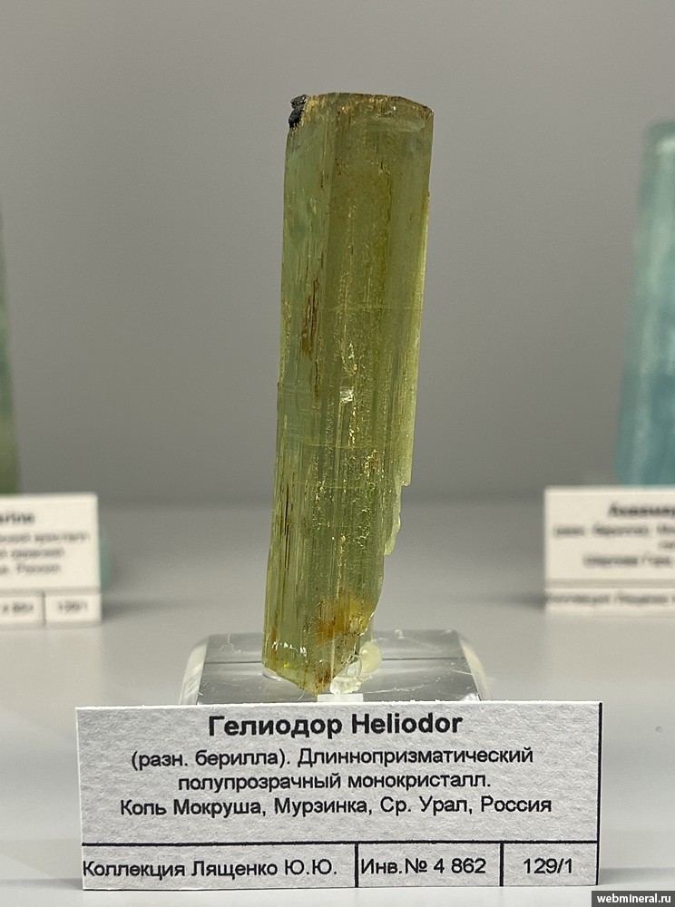 Полупрозрачный кристалл желтого берилла (гелиодора). Образец из коллекции Лященко Ю.Ю.