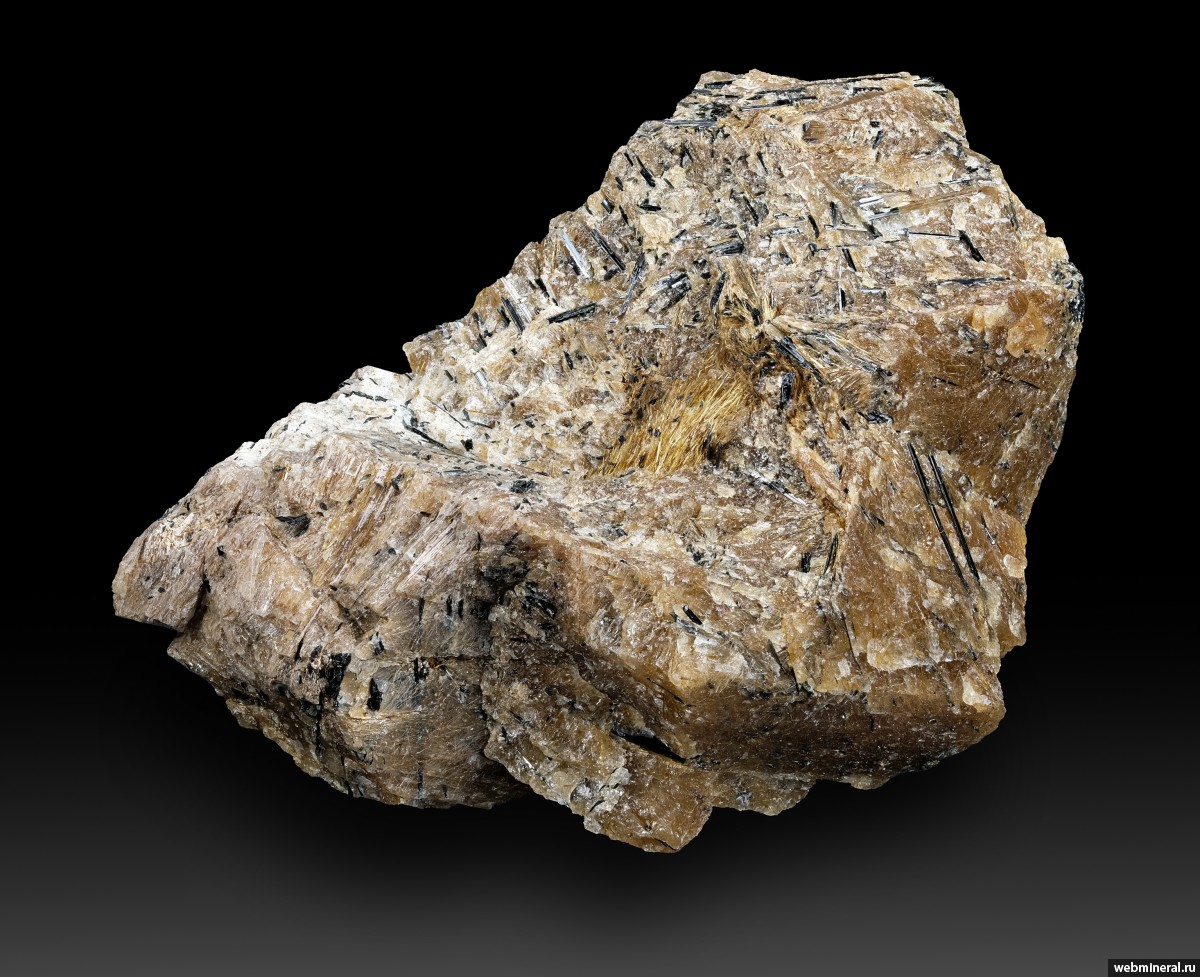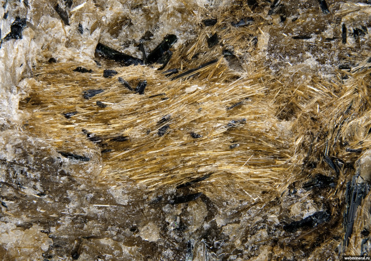 Массивный натролит с включением кристаллов золотистого игольчатого астрофиллита; на образце имеется скопление не заключенных в натролит тонковолокнистых кристаллов астрофиллита (длина зоны – 11 мм). Находка - август 2025 года.
