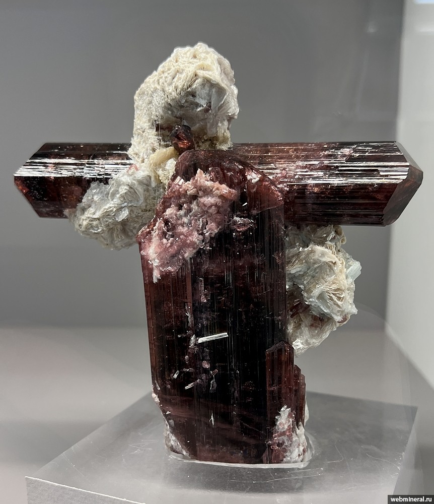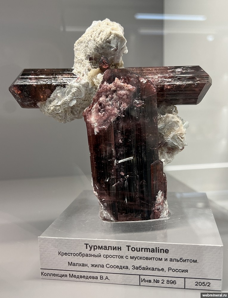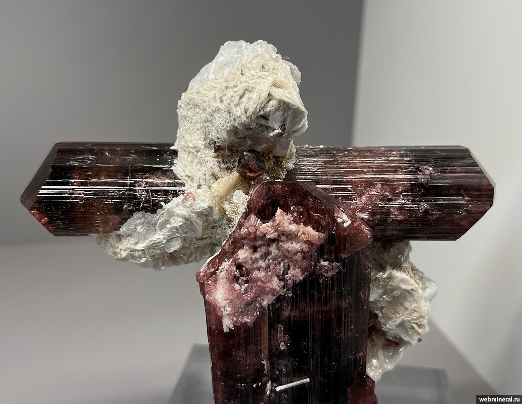 Крестообразный сросток кристаллов розового турмалина (эльбаита) с альбитом и лепидолитом. Образец из коллекции Медведева В.А.